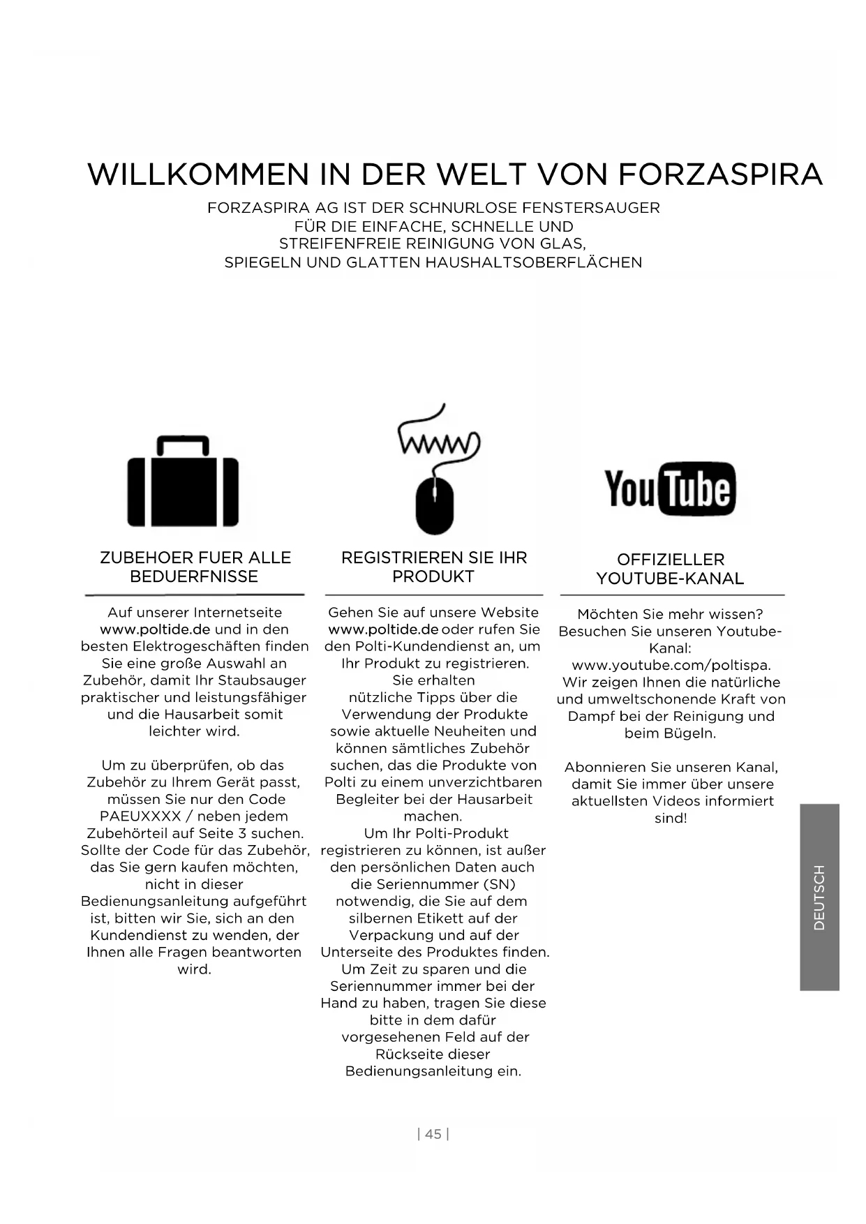BEDUERFNISSE Auf unserer Internetseite www.poltide.de und in den besten Elektrogeschäften finden Sie eine große Auswahl an Zubehör, damit Ihr Staubsauger praktischer und leistungsfähiger und die Hausarbeit somit leichter wird. Um zu überprüfen, ob das Zubehör zu Ihrem Gerät passt, müssen Sie nur den Code PAEUXXXX / neben jedem Zubehörteil auf Seite 3 suchen. Sollte der Code für das Zubehör, das Sie gern kaufen möchten, nicht in dieser Bedienungsanleitung aufgeführt ist, bitten wir Sie, sich an den Kundendienst zu wenden, der Ihnen alle Fragen beantworten wird. OFFIZIELLER YOUTUBE-KANAL Möchten Sie mehr wissen? Besuchen Sie unseren Youtube- Kanal: www.youtube.com/poltispa. Wir zeigen Ihnen die natürliche und umweltschonende Kraft von Dampf bei der Reinigung und beim Bügeln. Abonnieren Sie unseren Kanal, damit Sie immer über unsere aktuellsten Videos informiert sind!