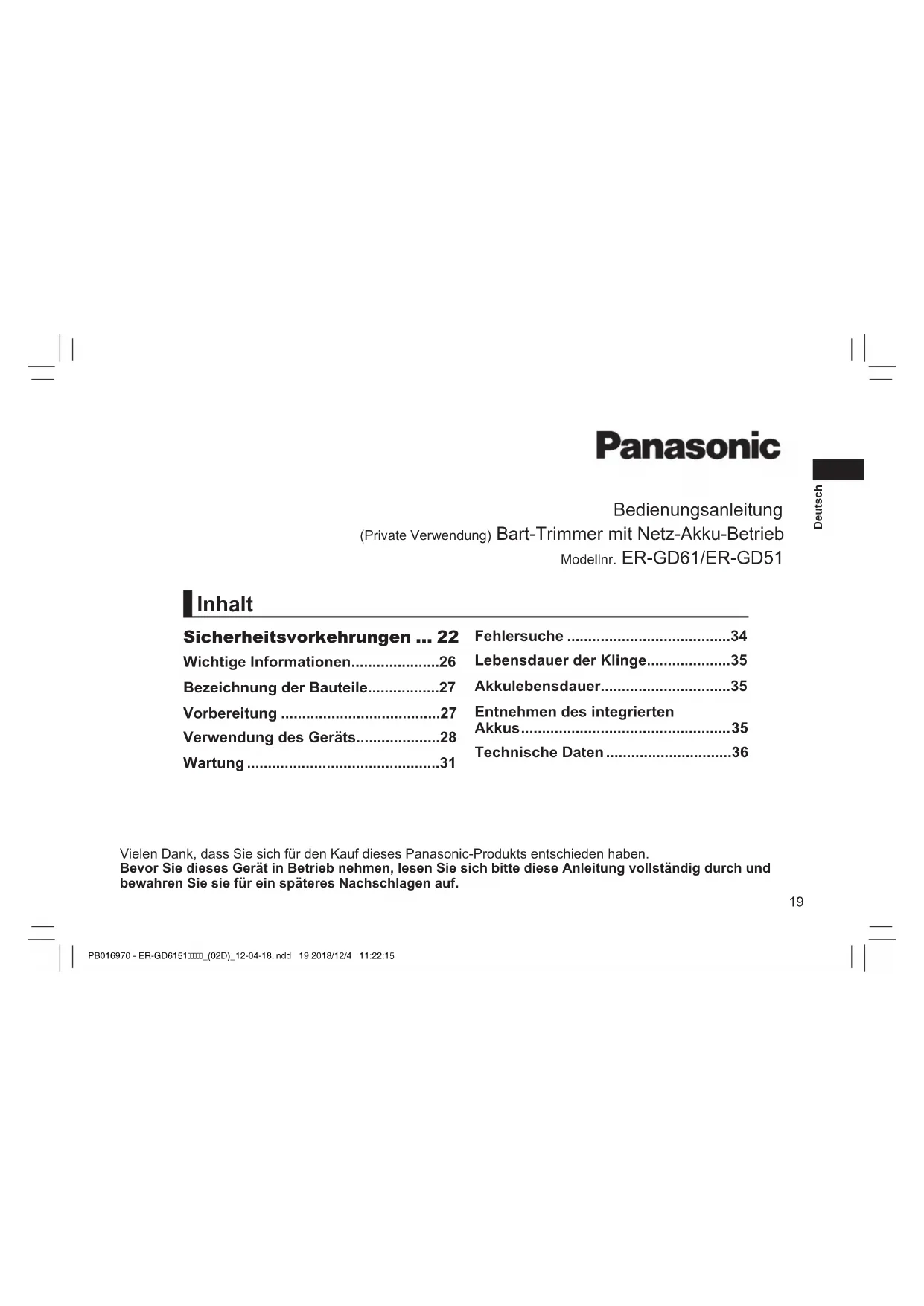 Verständigen Sie bitte sofort einen Arzt. PB016970 - ER-GD6151_(02D)_12-04-18.indd 25 2018/12/4 11:22:1726 Deutsch WARNUNG Nach der Entfernung des Akkus bewahren Sie diesen außer Reichweite von Kindern auf. - Wird der Akku versehentlich verschluckt, kann sie körperlichen Schaden verursachen.