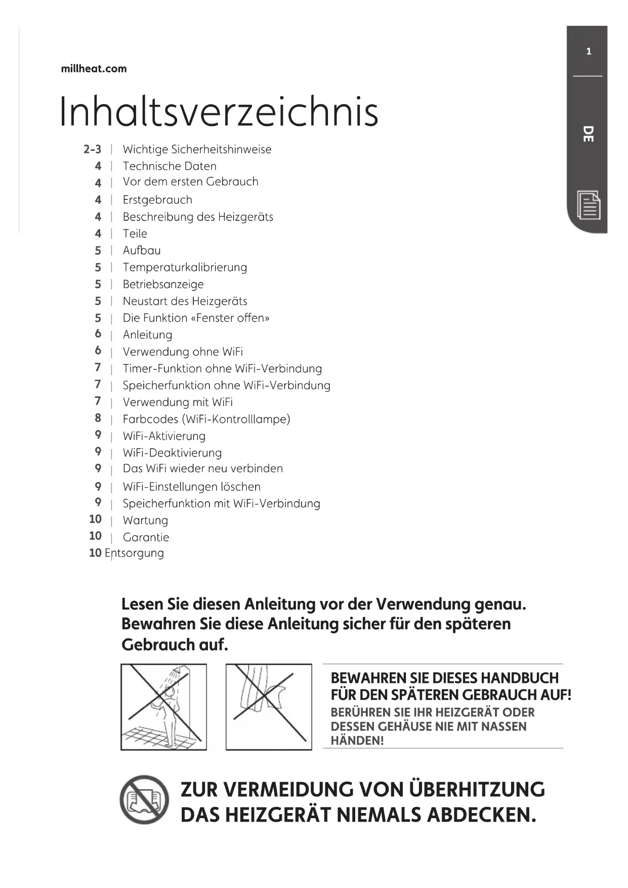 - Verwenden Sie dieses Heizgerät nicht in der unmittelbaren Umgebung eines Bads, einer Dusche oder eines Schwimmbads. millheat.com