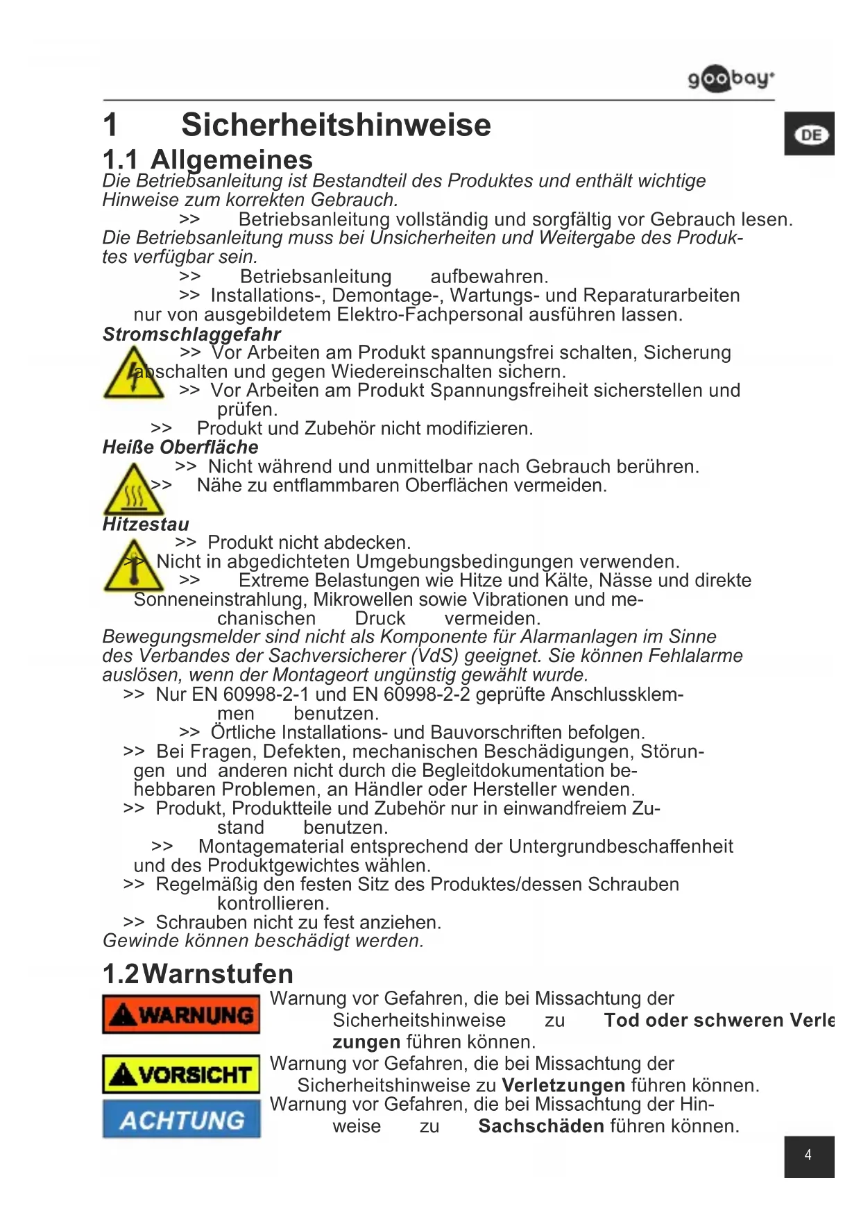 Die Betriebsanleitung ist Bestandteil des Produktes und enthält wichtige Hinweise zum korrekten Gebrauch. >> Betriebsanleitung vollständig und sorgfältig vor Gebrauch lesen. Die Betriebsanleitung muss bei Unsicherheiten und Weitergabe des Produk- tes verfügbar sein. >> Betriebsanleitung aufbewahren. >> Installations-, Demontage-, Wartungs- und Reparaturarbeiten nur von ausgebildetem Elektro-Fachpersonal ausführen lassen. Stromschlaggefahr >> Vor Arbeiten am Produkt spannungsfrei schalten, Sicherung abschalten und gegen Wiedereinschalten sichern. >> Vor Arbeiten am Produkt Spannungsfreiheit sicherstellen und prüfen. >> ProduktundZubehörnichtmodizieren. Heiße Oberäche >> Nicht während und unmittelbar nach Gebrauch berühren. >> NähezuentammbarenOberächenvermeiden. Hitzestau >> Produkt nicht abdecken. >> Nicht in abgedichteten Umgebungsbedingungen verwenden. >> Extreme Belastungen wie Hitze und Kälte, Nässe und direkte Sonneneinstrahlung, Mikrowellen sowie Vibrationen und me- chanischen Druck vermeiden. Bewegungsmelder sind nicht als Komponente für Alarmanlagen im Sinne des Verbandes der Sachversicherer (VdS) geeignet. Sie können Fehlalarme auslösen, wenn der Montageort ungünstig gewählt wurde. >> Nur EN 60998-2-1 und EN 60998-2-2 geprüfte Anschlussklem- men benutzen. >> Örtliche Installations- und Bauvorschriften befolgen. >> Bei Fragen, Defekten, mechanischen Beschädigungen, Störun- gen und anderen nicht durch die Begleitdokumentation be- hebbaren Problemen, an Händler oder Hersteller wenden. >> Produkt, Produktteile und Zubehör nur in einwandfreiem Zu- stand benutzen. >> MontagematerialentsprechendderUntergrundbeschaenheit und des Produktgewichtes wählen. >> Regelmäßig den festen Sitz des Produktes/dessen Schrauben kontrollieren. >> Schrauben nicht zu fest anziehen. Gewinde können beschädigt werden.