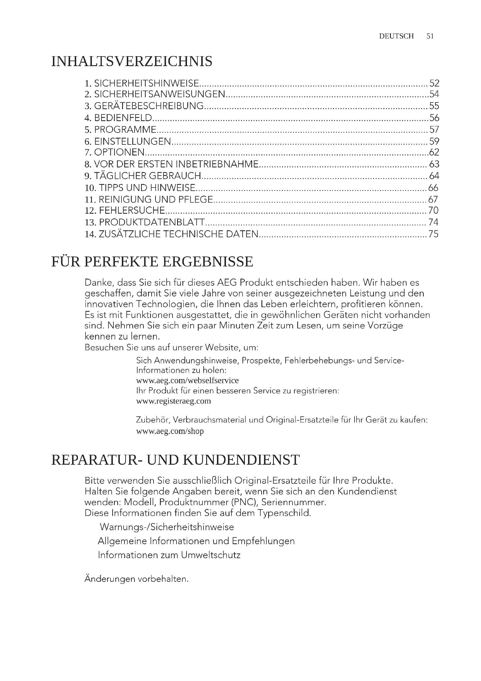 Danke, dass Sie sich für dieses AEG Produkt entschieden haben. Wir haben es geschaffen, damit Sie viele Jahre von seiner ausgezeichneten Leistung und den innovativen Technologien, die Ihnen das Leben erleichtern, profitieren können. Es ist mit Funktionen ausgestattet, die in gewöhnlichen Geräten nicht vorhanden sind. Nehmen Sie sich ein paar Minuten Zeit zum Lesen, um seine Vorzüge kennen zu lernen. Besuchen Sie uns auf unserer Website, um: Sich Anwendungshinweise, Prospekte, Fehlerbehebungs- und Service- Informationen zu holen: www.aeg.com/webselfservice Ihr Produkt für einen besseren Service zu registrieren: www.registeraeg.com Zubehör, Verbrauchsmaterial und Original-Ersatzteile für Ihr Gerät zu kaufen: www.aeg.com/shop