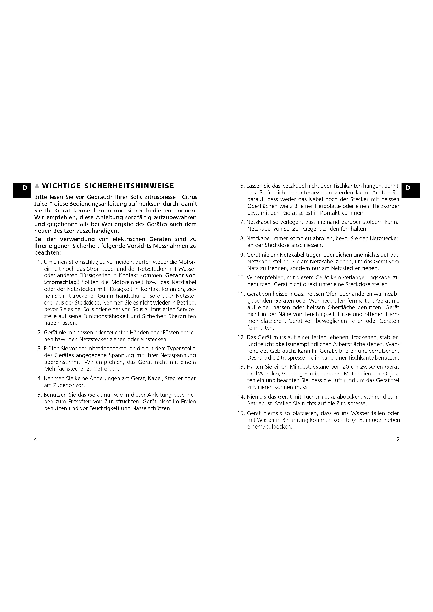 WICHTIGE SICHERHEITSHINWEISE Bitte lesen Sie vor Gebrauch Ihrer Solis Zitruspresse “Citrus Juicer” diese Bedienungsanleitung aufmerksam durch, damit Sie Ihr Gerät kennenlernen und sicher bedienen können. Wir empfehlen, diese Anleitung sorgfältig aufzubewahren und gegebenenfalls bei Weitergabe des Gerätes auch dem neuen Besitzer auszuhändigen. Bei der Verwendung von elektrischen Geräten sind zu Ihrer eigenen Sicherheit folgende Vorsichts-Massnahmen zu beachten: