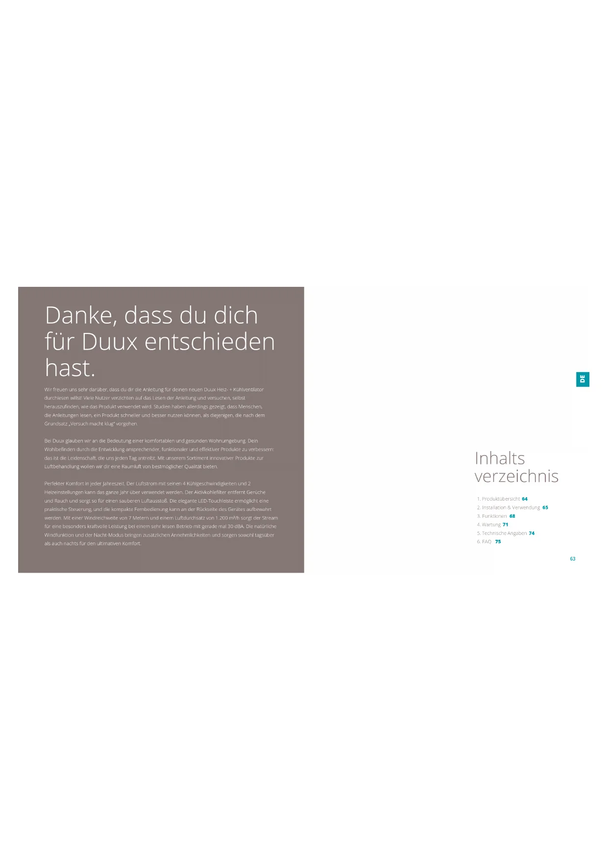 ES6362 Danke, dass du dich für Duux entschieden hast. Wir freuen uns sehr darüber, dass du dir die Anleitung für deinen neuen Duux Heiz- + Kühlventilator durchlesen willst! Viele Nutzer verzichten auf das Lesen der Anleitung und versuchen, selbst herauszunden, wie das Produkt verwendet wird. Studien haben allerdings gezeigt, dass Menschen, die Anleitungen lesen, ein Produkt schneller und besser nutzen können, als diejenigen, die nach dem Grundsatz „Versuch macht klug“ vorgehen. Bei Duux glauben wir an die Bedeutung einer komfortablen und gesunden Wohnumgebung. Dein Wohlbenden durch die Entwicklung ansprechender, funktionaler und eektiver Produkte zu verbessern: das ist die Leidenschaft, die uns jeden Tag antreibt. Mit unserem Sortiment innovativer Produkte zur Luftbehandlung wollen wir dir eine Raumluft von bestmöglicher Qualität bieten. Perfekter Komfort in jeder Jahreszeit. Der Luftstrom mit seinen 4 Kühlgeschwindigkeiten und 2 Heizeinstellungen kann das ganze Jahr über verwendet werden. Der Aktivkohlelter entfernt Gerüche und Rauch und sorgt so für einen sauberen Luftausstoß. Die elegante LED-Touchleiste ermöglicht eine praktische Steuerung, und die kompakte Fernbedienung kann an der Rückseite des Gerätes aufbewahrt werden. Mit einer Windreichweite von 7 Metern und einem Luftdurchsatz von 1.200 m³/h sorgt der Stream für eine besonders kraftvolle Leistung bei einem sehr leisen Betrieb mit gerade mal 30 dBA. Die natürliche Windfunktion und der Nacht-Modus bringen zusätzlichen Annehmlichkeiten und sorgen sowohl tagsüber als auch nachts für den ultimativen Komfort.