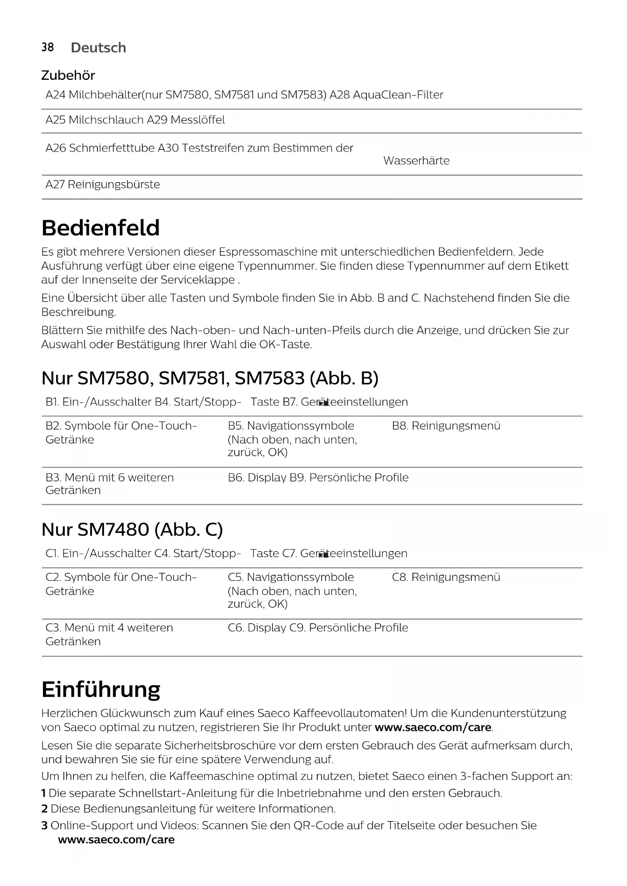 DeutschA26 Schmierfetttube A30 Teststreifen zum Bestimmen derWasserhärteA27 Reinigungsbürste Bedienfeld Es gibt mehrere Versionen dieser Espressomaschine mit unterschiedlichen Bedienfeldern. JedeAusführung verfügt über eine eigene Typennummer. Sie finden diese Typennummer auf dem Etikettauf der Innenseite der Serviceklappe .Eine Übersicht über alle Tasten und Symbole finden Sie in Abb. B and C. Nachstehend finden Sie dieBeschreibung. Blättern Sie mithilfe des Nach-oben- und Nach-unten-Pfeils durch die Anzeige, und drücken Sie zurAuswahl oder Bestätigung Ihrer Wahl die OK-Taste. Nur SM7580, SM7581, SM7583 (Abb. B) B1. Ein-/Ausschalter B4. Start/Stopp- Taste B7. GeräteeinstellungenB2. Symbole für One-Touch-GetränkeB5. Navigationssymbole(Nach oben, nach unten,zurück, OK) B8. ReinigungsmenüB3. Menü mit 6 weiterenGetränken B6. Display B9. Persönliche Profile Nur SM7480 (Abb. C) C1. Ein-/Ausschalter C4. Start/Stopp- Taste C7. GeräteeinstellungenC2. Symbole für One-Touch-GetränkeC5. Navigationssymbole(Nach oben, nach unten,zurück, OK) C8. ReinigungsmenüC3. Menü mit 4 weiterenGetränkenC6. Display C9. Persönliche Profile Einführung Herzlichen Glückwunsch zum Kauf eines Saeco Kaffeevollautomaten! Um die Kundenunterstützungvon Saeco optimal zu nutzen, registrieren Sie Ihr Produkt unter www.saeco.com/care. Lesen Sie die separate Sicherheitsbroschüre vor dem ersten Gebrauch des Gerät aufmerksam durch,und bewahren Sie sie für eine spätere Verwendung auf.Um Ihnen zu helfen, die Kaffeemaschine optimal zu nutzen, bietet Saeco einen 3-fachen Support an:1 Die separate Schnellstart-Anleitung für die Inbetriebnahme und den ersten Gebrauch.2 Diese Bedienungsanleitung für weitere Informationen.3 Online-Support und Videos: Scannen Sie den QR-Code auf der Titelseite oder besuchen Siewww.saeco.com/care