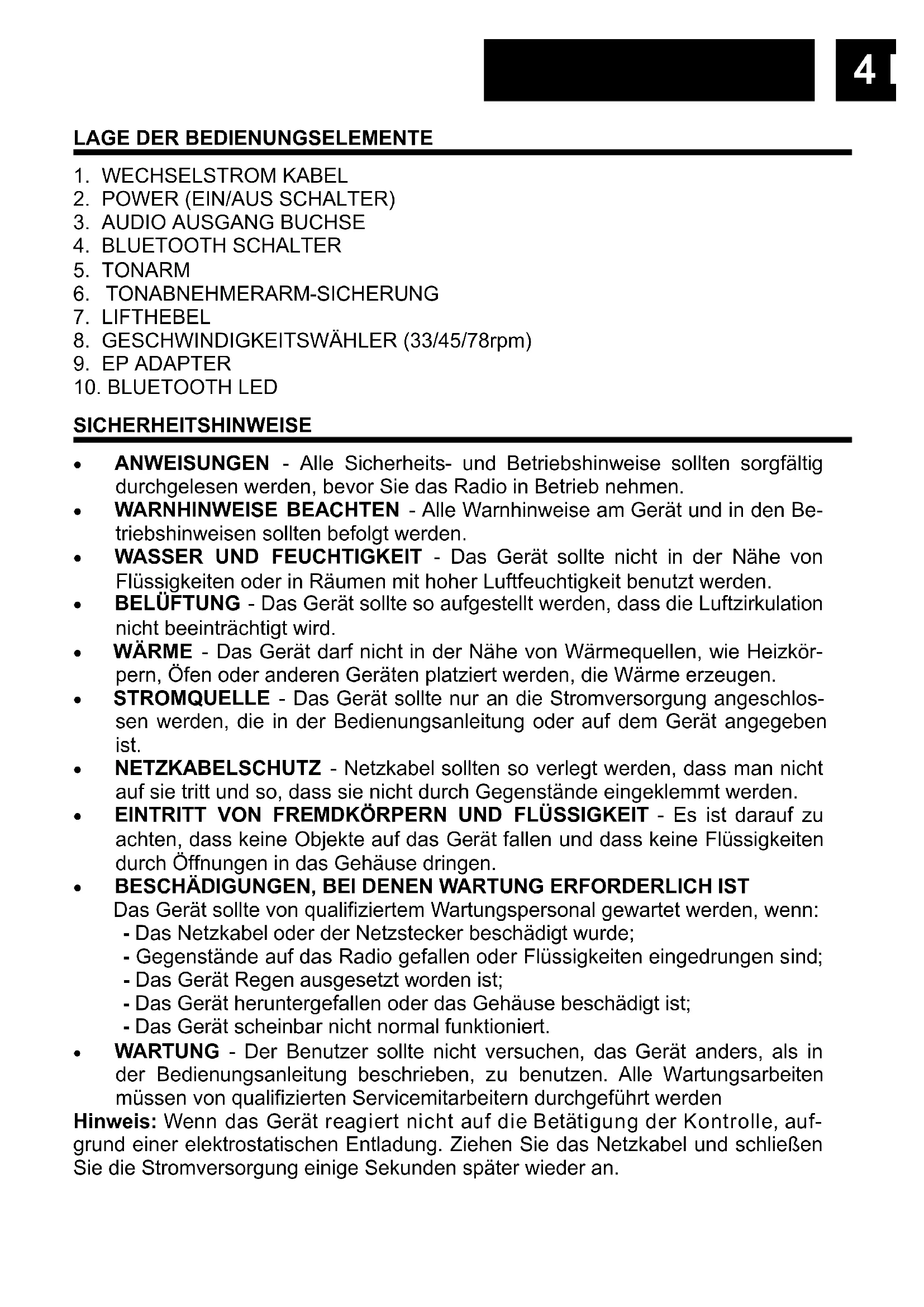 SICHERHEITSHINWEISE ANWEISUNGEN - Alle Sicherheits- und Betriebshinweise sollten sorgfältig durchgelesen werden, bevor Sie das Radio in Betrieb nehmen. WARNHINWEISE BEACHTEN - Alle Warnhinweise am Gerät und in den Be- triebshinweisen sollten befolgt werden. WASSER UND FEUCHTIGKEIT - Das Gerät sollte nicht in der Nähe von Flüssigkeiten oder in Räumen mit hoher Luftfeuchtigkeit benutzt werden. BELÜFTUNG - Das Gerät sollte so aufgestellt werden, dass die Luftzirkulation nicht beeinträchtigt wird. WÄRME - Das Gerät darf nicht in der Nähe von Wärmequellen, wie Heizkör- pern, Öfen oder anderen Geräten platziert werden, die Wärme erzeugen. STROMQUELLE - Das Gerät sollte nur an die Stromversorgung angeschlos- sen werden, die in der Bedienungsanleitung oder auf dem Gerät angegeben ist. NETZKABELSCHUTZ - Netzkabel sollten so verlegt werden, dass man nicht auf sie tritt und so, dass sie nicht durch Gegenstände eingeklemmt werden. EINTRITT VON FREMDKÖRPERN UND FLÜSSIGKEIT - Es ist darauf zu achten, dass keine Objekte auf das Gerät fallen und dass keine Flüssigkeiten durch Öffnungen in das Gehäuse dringen. BESCHÄDIGUNGEN, BEI DENEN WARTUNG ERFORDERLICH IST Das Gerät sollte von qualifiziertem Wartungspersonal gewartet werden, wenn: - Das Netzkabel oder der Netzstecker beschädigt wurde; - Gegenstände auf das Radio gefallen oder Flüssigkeiten eingedrungen sind; - Das Gerät Regen ausgesetzt worden ist; - Das Gerät heruntergefallen oder das Gehäuse beschädigt ist; - Das Gerät scheinbar nicht normal funktioniert. WARTUNG - Der Benutzer sollte nicht versuchen, das Gerät anders, als in der Bedienungsanleitung beschrieben, zu benutzen. Alle Wartungsarbeiten müssen von qualifizierten Servicemitarbeitern durchgeführt werden Hinweis: Wenn das Gerät reagiert nicht auf die Betätigung der Kontrolle, auf- grund einer elektrostatischen Entladung. Ziehen Sie das Netzkabel und schließen Sie die Stromversorgung einige Sekunden später wieder an.5 Deutsch STROMQUELLEN WECHSELSTROM: Sie können Ihr tragbares Stereosystem mit Strom versorgen, in- dem Sie das Netzkabel in den Netzstecker (1) an der Rückseite des Gerätes und dann in eine Steckdose anschliessen. Uberprüfen Sie, ob die Nennspannung Ihres Geräts mit Ihrer örtlichen Spannung übereinstimmt. Stellen Sie sicher, dass das Netzkabel vollständig in das Gerät einge- setzt ist. SCHALLPLATTEN MODUS