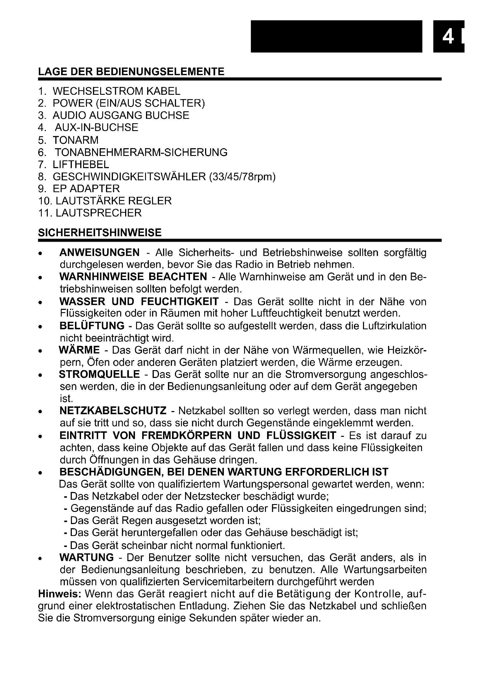 SICHERHEITSHINWEISE ANWEISUNGEN - Alle Sicherheits- und Betriebshinweise sollten sorgfältig durchgelesen werden, bevor Sie das Radio in Betrieb nehmen. WARNHINWEISE BEACHTEN - Alle Warnhinweise am Gerät und in den Be- triebshinweisen sollten befolgt werden. WASSER UND FEUCHTIGKEIT - Das Gerät sollte nicht in der Nähe von Flüssigkeiten oder in Räumen mit hoher Luftfeuchtigkeit benutzt werden. BELÜFTUNG - Das Gerät sollte so aufgestellt werden, dass die Luftzirkulation nicht beeinträchtigt wird. WÄRME - Das Gerät darf nicht in der Nähe von Wärmequellen, wie Heizkör- pern, Öfen oder anderen Geräten platziert werden, die Wärme erzeugen. STROMQUELLE - Das Gerät sollte nur an die Stromversorgung angeschlos- sen werden, die in der Bedienungsanleitung oder auf dem Gerät angegeben ist. NETZKABELSCHUTZ - Netzkabel sollten so verlegt werden, dass man nicht auf sie tritt und so, dass sie nicht durch Gegenstände eingeklemmt werden. EINTRITT VON FREMDKÖRPERN UND FLÜSSIGKEIT - Es ist darauf zu achten, dass keine Objekte auf das Gerät fallen und dass keine Flüssigkeiten durch Öffnungen in das Gehäuse dringen. BESCHÄDIGUNGEN, BEI DENEN WARTUNG ERFORDERLICH IST Das Gerät sollte von qualifiziertem Wartungspersonal gewartet werden, wenn: - Das Netzkabel oder der Netzstecker beschädigt wurde; - Gegenstände auf das Radio gefallen oder Flüssigkeiten eingedrungen sind; - Das Gerät Regen ausgesetzt worden ist; - Das Gerät heruntergefallen oder das Gehäuse beschädigt ist; - Das Gerät scheinbar nicht normal funktioniert. WARTUNG - Der Benutzer sollte nicht versuchen, das Gerät anders, als in der Bedienungsanleitung beschrieben, zu benutzen. Alle Wartungsarbeiten müssen von qualifizierten Servicemitarbeitern durchgeführt werden Hinweis: Wenn das Gerät reagiert nicht auf die Betätigung der Kontrolle, auf- grund einer elektrostatischen Entladung. Ziehen Sie das Netzkabel und schließen Sie die Stromversorgung einige Sekunden später wieder an.5 Deutsch STROMQUELLEN WECHSELSTROM: Sie können Ihr tragbares Stereosystem mit Strom versorgen, in- dem Sie das Netzkabel in den Netzstecker (1) an der Rückseite des Gerätes und dann in eine Steckdose anschliessen. Uberprüfen Sie, ob die Nennspannung Ihres Geräts mit Ihrer örtlichen Spannung übereinstimmt. Stellen Sie sicher, dass das Netzkabel vollständig in das Gerät einge- setzt ist. SCHALLPLATTEN MODUS