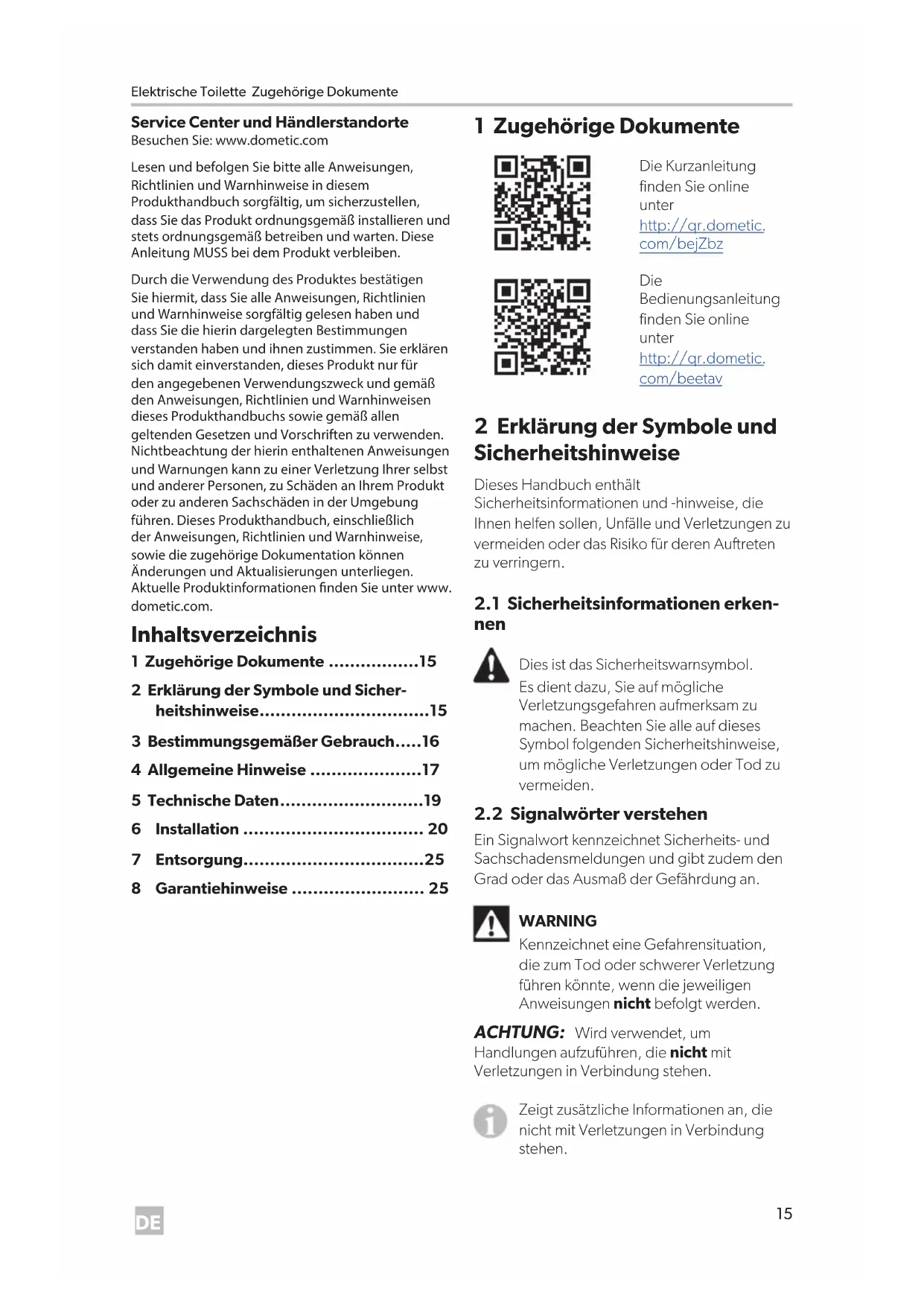 - 8 Garantiehinweise 1 Zugehörige Dokumente Die Kurzanleitung finden Sie online unter http://qr.dometic. com/bejZbz Die Bedienungsanleitung finden Sie online unter http://qr.dometic. com/beetav 2 Erklärung der Symbole und Sicherheitshinweise Dieses Handbuch enthält Sicherheitsinformationen und -hinweise, die Ihnen helfen sollen, Unfälle und Verletzungen zu vermeiden oder das Risiko für deren Aureten zu verringern. p. 25
