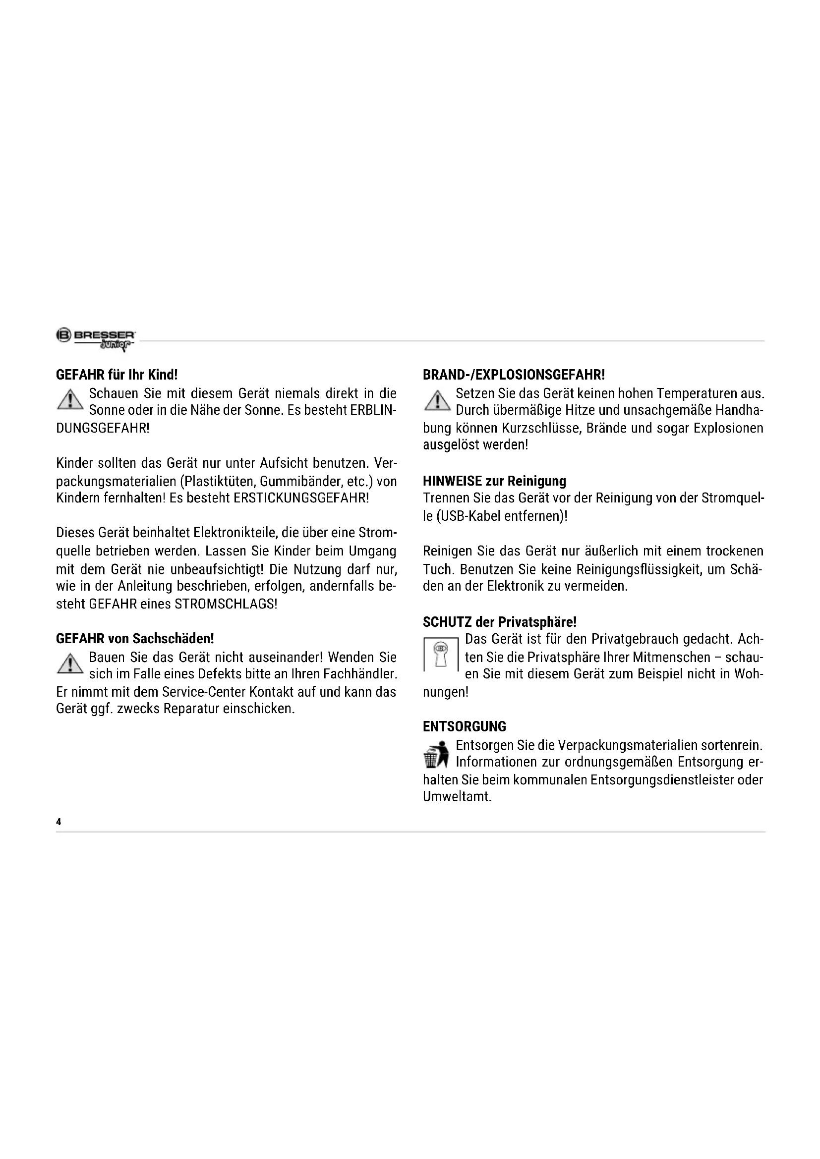 BRAND-/EXPLOSIONSGEFAHR! Setzen Sie das Gerät keinen hohen Temperaturen aus. Durch übermäßige Hitze und unsachgemäße Handha- bung können Kurzschlüsse, Brände und sogar Explosionen ausgelöst werden! HINWEISE zur Reinigung Trennen Sie das Gerät vor der Reinigung von der Stromquel- le (USB-Kabel entfernen)! Reinigen Sie das Gerät nur äußerlich mit einem trockenen Tuch. Benutzen Sie keine Reinigungsüssigkeit, um Schä- den an der Elektronik zu vermeiden. SCHUTZ der Privatsphäre! Das Gerät ist für den Privatgebrauch gedacht. Ach- ten Sie die Privatsphäre Ihrer Mitmenschen – schau- en Sie mit diesem Gerät zum Beispiel nicht in Woh- nungen! ENTSORGUNG Entsorgen Sie die Verpackungsmaterialien sortenrein. Informationen zur ordnungsgemäßen Entsorgung er- halten Sie beim kommunalen Entsorgungsdienstleister oder Umweltamt. GEFAHR für Ihr Kind! Schauen Sie mit diesem Gerät niemals direkt in die Sonne oder in die Nähe der Sonne. Es besteht ERBLIN- DUNGSGEFAHR! Kinder sollten das Gerät nur unter Aufsicht benutzen. Ver- packungsmaterialien (Plastiktüten, Gummibänder, etc.) von Kindern fernhalten! Es besteht ERSTICKUNGSGEFAHR! Dieses Gerät beinhaltet Elektronikteile, die über eine Strom- quelle betrieben werden. Lassen Sie Kinder beim Umgang mit dem Gerät nie unbeaufsichtigt! Die Nutzung darf nur, wie in der Anleitung beschrieben, erfolgen, andernfalls be- steht GEFAHR eines STROMSCHLAGS! GEFAHR von Sachschäden! Bauen Sie das Gerät nicht auseinander! Wenden Sie sich im Falle eines Defekts bitte an Ihren Fachhändler. Er nimmt mit dem Service-Center Kontakt auf und kann das Gerät ggf. zwecks Reparatur einschicken.5