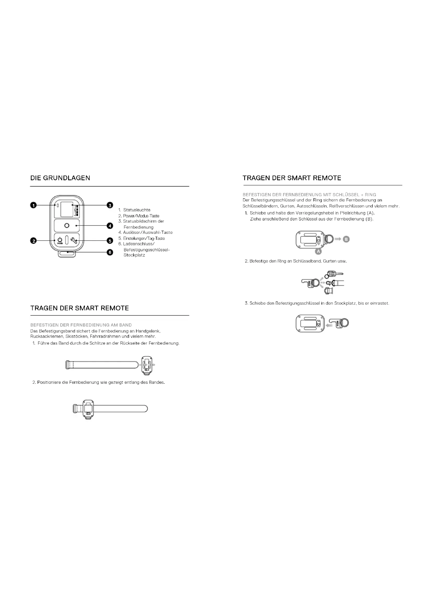 BEFESTIGEN DER FERNBEDIENUNG MIT SCHLÜSSEL + RING Der Befestigungsschlüssel und der Ring sichern die Fernbedienung an Schlüsselbändern, Gurten, Autoschlüsseln, Reißverschlüssen und vielem mehr.