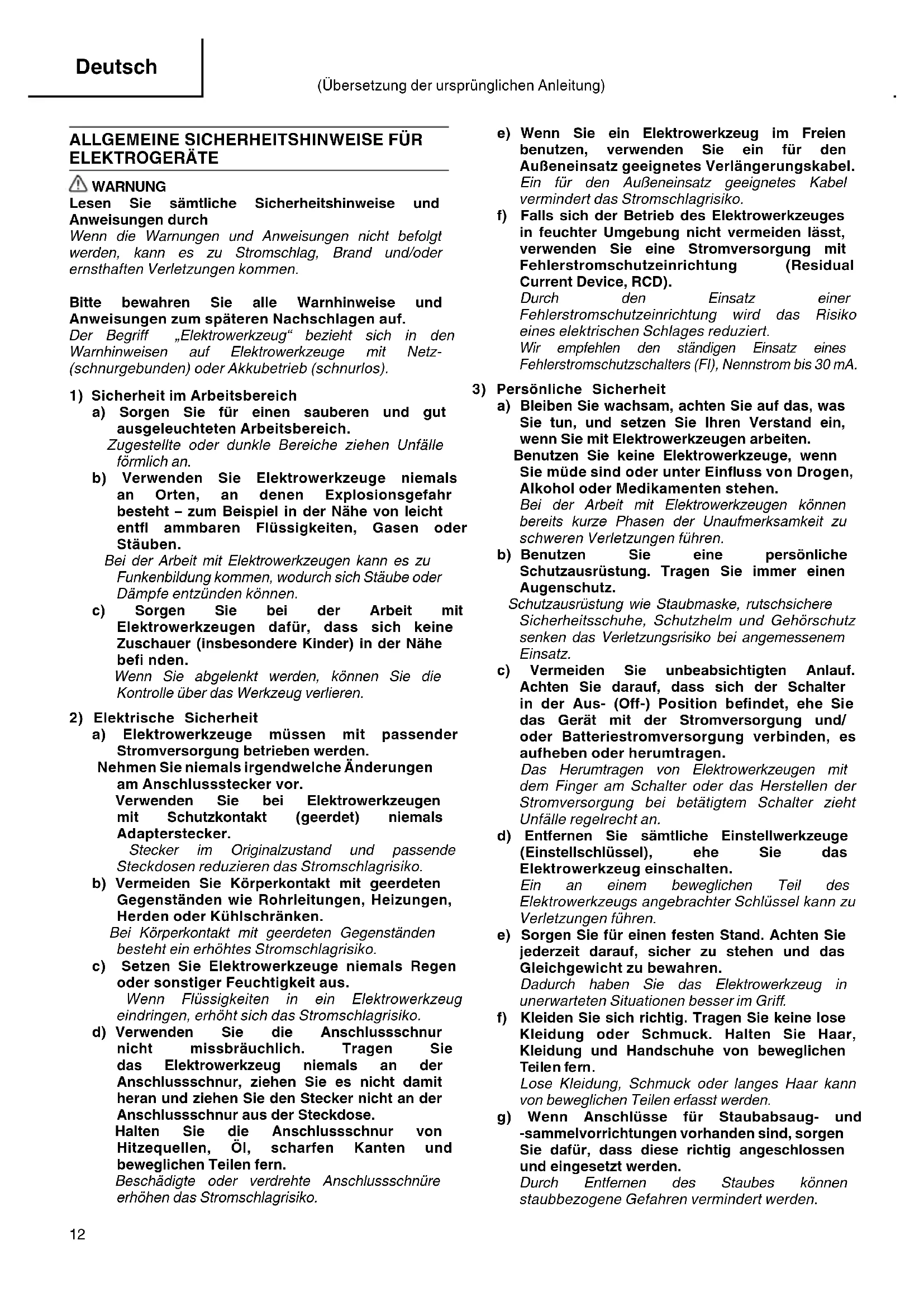 a) Bleiben Sie wachsam, achten Sie auf das, was Sie tun, und setzen Sie Ihren Verstand ein, wenn Sie mit Elektrowerkzeugen arbeiten. Benutzen Sie keine Elektrowerkzeuge, wenn Sie müde sind oder unter Einfl uss von Drogen, Alkohol oder Medikamenten stehen. Bei der Arbeit mit Elektrowerkzeugen können bereits kurze Phasen der Unaufmerksamkeit zu schweren Verletzungen führen. b) Benutzen Sie eine persönliche Schutzausrüstung. Tragen Sie immer einen Augenschutz. Schutzausrüstung wie Staubmaske, rutschsichere Sicherheitsschuhe, Schutzhelm und Gehörschutz senken das Verletzungsrisiko bei angemessenem Einsatz. c) Vermeiden Sie unbeabsichtigten Anlauf. Achten Sie darauf, dass sich der Schalter in der Aus- (Off -) Position befi ndet, ehe Sie das Gerät mit der Stromversorgung und/ oder Batteriestromversorgung verbinden, es aufheben oder herumtragen. Das Herumtragen von Elektrowerkzeugen mit dem Finger am Schalter oder das Herstellen der Stromversorgung bei betätigtem Schalter zieht Unfälle regelrecht an. d) Entfernen Sie sämtliche Einstellwerkzeuge (Einstellschlüssel), ehe Sie das Elektrowerkzeug einschalten. Ein an einem beweglichen Teil des Elektrowerkzeugs angebrachter Schlüssel kann zu Verletzungen führen. e) Sorgen Sie für einen festen Stand. Achten Sie jederzeit darauf, sicher zu stehen und das Gleichgewicht zu bewahren. Dadurch haben Sie das Elektrowerkzeug in unerwarteten Situationen besser im Griff . f) Kleiden Sie sich richtig. Tragen Sie keine lose Kleidung oder Schmuck. Halten Sie Haar, Kleidung und Handschuhe von beweglichen Teilen fern. Lose Kleidung, Schmuck oder langes Haar kann von beweglichen Teilen erfasst werden. g) Wenn Anschlüsse für Staubabsaug- und -sammelvorrichtungen vorhanden sind, sorgen Sie dafür, dass diese richtig angeschlossen und eingesetzt werden. Durch Entfernen des Staubes können staubbezogene Gefahren vermindert werden. 0000BookM12VE.indb120000BookM12VE.indb12 2017/11/3016:52:472017/11/3016:52:4713 Deutsch