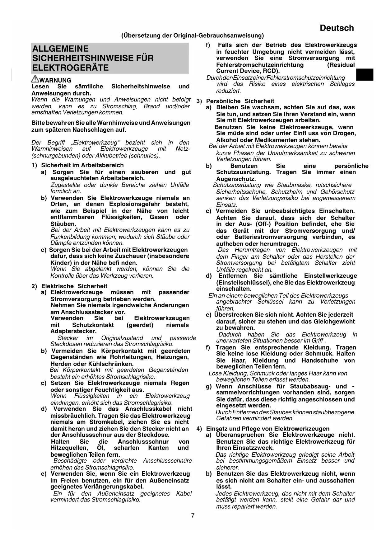 a) Überanspruchen Sie Elektrowerkzeuge nicht. Benutzen Sie das richtige Elektrowerkzeug für Ihren Einsatzzweck. Das richtige Elektrowerkzeug erledigt seine Arbeit bei bestimmungsgemäßem Einsatz besser und sicherer. b) Benutzen Sie das Elektrowerkzeug nicht, wenn es sich nicht am Schalter ein- und ausschalten lässt. Jedes Elektrowerkzeug, das nicht mit dem Schalter betätigt werden kann, stellt eine Gefahr dar und muss repariert werden. ALLGEMEINE