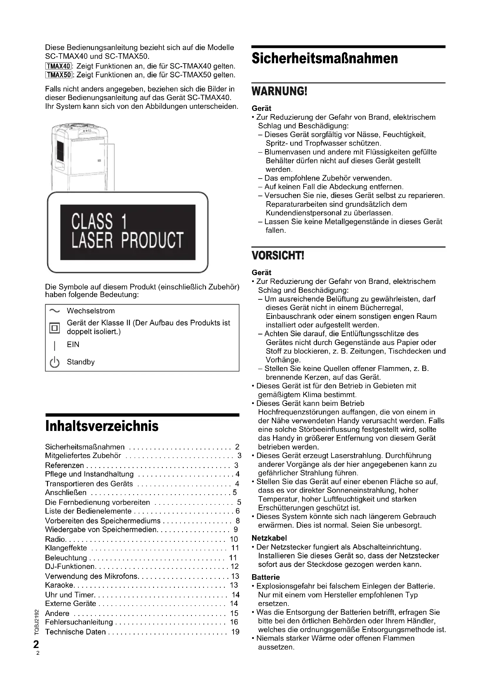 - Technische Daten Sicherheitsmaßnahmen WARNUNG! Gerät• Zur Reduzierung der Gefahr von Brand, elektrischem Schlag und Beschädigung:– Dieses Gerät sorgfältig vor Nässe, Feuchtigkeit, Spritz- und Tropfwasser schützen.– Blumenvasen und andere mit Flüssigkeiten gefüllte Behälter dürfen nicht auf dieses Gerät gestellt werden.– Das empfohlene Zubehör verwenden.– Auf keinen Fall die Abdeckung entfernen.– Versuchen Sie nie, dieses Gerät selbst zu reparieren. Reparaturarbeiten sind grundsätzlich dem Kundendienstpersonal zu überlassen.– Lassen Sie keine Metallgegenstände in dieses Gerät fallen. VORSICHT! Gerät• Zur Reduzierung der Gefahr von Brand, elektrischem Schlag und Beschädigung:– Um ausreichende Belüftung zu gewährleisten, darf dieses Gerät nicht in einem Bücherregal, Einbauschrank oder einem sonstigen engen Raum installiert oder aufgestellt werden.– Achten Sie darauf, die Entlüftungsschlitze des Gerätes nicht durch Gegenstände aus Papier oder Stoff zu blockieren, z. B. Zeitungen, Tischdecken und Vorhänge.– Stellen Sie keine Quellen offener Flammen, z. B. brennende Kerzen, auf das Gerät.• Dieses Gerät ist für den Betrieb in Gebieten mit gemäßigtem Klima bestimmt.• Dieses Gerät kann beim Betrieb Hochfrequenzstörungen auffangen, die von einem in der Nähe verwendeten Handy verursacht werden. Falls eine solche Störbeeinflussung festgestellt wird, sollte das Handy in größerer Entfernung von diesem Gerät betrieben werden.• Dieses Gerät erzeugt Laserstrahlung. Durchführung anderer Vorgänge als der hier angegebenen kann zu gefährlicher Strahlung führen. • Stellen Sie das Gerät auf einer ebenen Fläche so auf, dass es vor direkter Sonneneinstrahlung, hoher Temperatur, hoher Luftfeuchtigkeit und starken Erschütterungen geschützt ist.• Dieses System könnte sich nach längerem Gebrauch erwärmen. Dies ist normal. Seien Sie unbesorgt.Netzkabel• Der Netzstecker fungiert als Abschalteinrichtung. Installieren Sie dieses Gerät so, dass der Netzstecker sofort aus der Steckdose gezogen werden kann.Batterie• Explosionsgefahr bei falschem Einlegen der Batterie. Nur mit einem vom Hersteller empfohlenen Typ ersetzen.• Was die Entsorgung der Batterien betrifft, erfragen Sie bitte bei den örtlichen Behörden oder Ihrem Händler, welches die ordnungsgemäße Entsorgungsmethode ist.• Niemals starker Wärme oder offenen Flammen aussetzen.[TMAX40]:[TMAX50]:Zeigt Funktionen an, die für SC-TMAX40 gelten.Zeigt Funktionen an, die für SC-TMAX50 gelten.WechselstromGerät der Klasse II (Der Aufbau des Produkts ist doppelt isoliert.) EIN Standby TMAX40.50E_TQBJ2192_Ge.Fr.It.Du.Sp.book Page 2 Wednesday, July 3, 2019 1:45 PM offset printingConfidential Until: 02 Aug 2019 p. 19