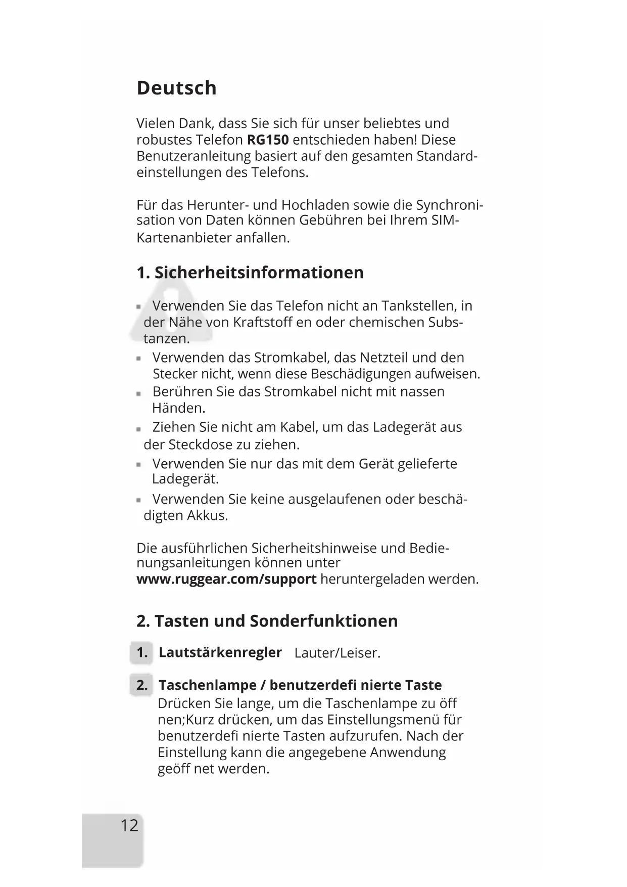 Die ausführlichen Sicherheitshinweise und Bedienungsanleitungen können unter www.ruggear.com/support heruntergeladen werden.
