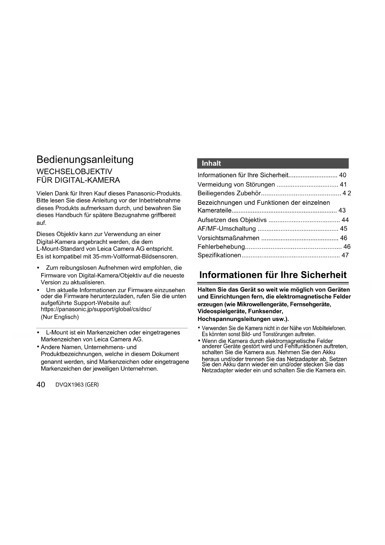 - Vielen Dank für Ihren Kauf dieses Panasonic-Produkts.Bitte lesen Sie diese Anleitung vor der Inbetriebnahme dieses Produkts aufmerksam durch, und bewahren Sie dieses Handbuch für spätere Bezugnahme griffbereit auf. Dieses Objektiv kann zur Verwendung an einer Digital-Kamera angebracht werden, die dem L-Mount-Standard von Leica Camera AG entspricht. Es ist kompatibel mit 35-mm-Vollformat-Bildsensoren. 0 Zum reibungslosen Aufnehmen wird empfohlen, die Firmware von Digital-Kamera/Objektiv auf die neueste Version zu aktualisieren. 0 Um aktuelle Informationen zur Firmware einzusehen oder die Firmware herunterzuladen, rufen Sie die unten aufgeführte Support-Website auf:https://panasonic.jp/support/global/cs/dsc/(Nur Englisch) 0 L-Mount ist ein Markenzeichen oder eingetragenes Markenzeichen von Leica Camera AG. Andere Namen, Unternehmens- und Produktbezeichnungen, welche in diesem Dokument genannt werden, sind Markenzeichen oder eingetragene Markenzeichen der jeweiligen Unternehmen. Informationen für Ihre Sicherheit p. 40