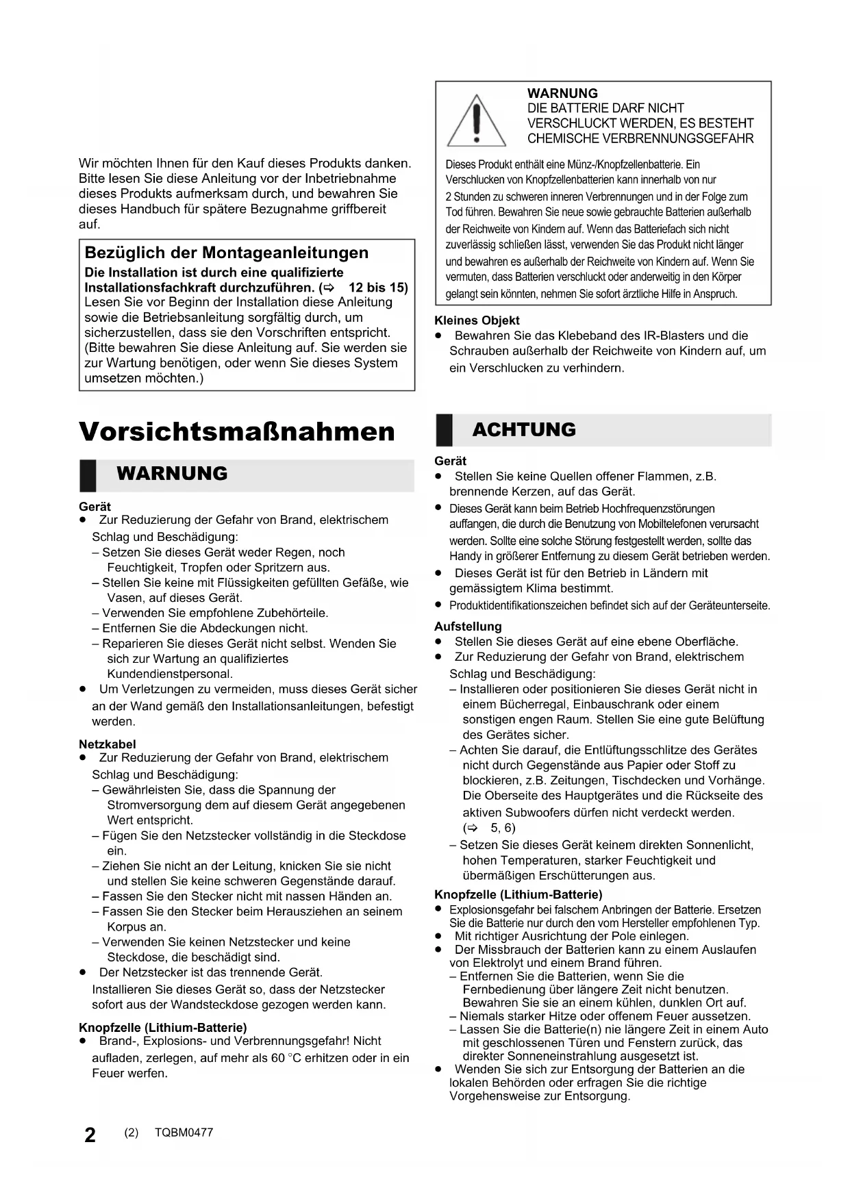 TQBM0477 Bedienungsanleitung Mode d’emploi Istruzioni per l’uso Instrucciones de funcionamiento Gebruiksaanwijzing Heimkino-Audiosystem Systèmehomecinéma Sistema audio Home Theater SistemadeCineenCasa Audiosysteem Home Theater Modell Nr./Modèle n°/Model No./Modelo N./Model Nr. SC-HTB900 For Pana Ref-SC-HTB900-EG-TQBM0477_eng.book 1 ページ 2019年4月12日 金曜日 午後10時38分2 TQBM0477 Wir möchten Ihnen für den Kauf dieses Produkts danken. Bitte lesen Sie diese Anleitung vor der Inbetriebnahme dieses Produkts aufmerksam durch, und bewahren Sie dieses Handbuch für spätere Bezugnahme griffbereit auf. Vorsichtsmaßnahmen Gerät≥ Zur Reduzierung der Gefahr von Brand, elektrischem Schlag und Beschädigung:– Setzen Sie dieses Gerät weder Regen, noch Feuchtigkeit, Tropfen oder Spritzern aus.– Stellen Sie keine mit Flüssigkeiten gefüllten Gefäße, wie Vasen, auf dieses Gerät.– Verwenden Sie empfohlene Zubehörteile.– Entfernen Sie die Abdeckungen nicht.– Reparieren Sie dieses Gerät nicht selbst. Wenden Sie sich zur Wartung an qualifiziertes Kundendienstpersonal.≥ Um Verletzungen zu vermeiden, muss dieses Gerät sicher an der Wand gemäß den Installationsanleitungen, befestigt werden.Netzkabel≥ Zur Reduzierung der Gefahr von Brand, elektrischem Schlag und Beschädigung:– Gewährleisten Sie, dass die Spannung der Stromversorgung dem auf diesem Gerät angegebenen Wert entspricht.– Fügen Sie den Netzstecker vollständig in die Steckdose ein. – Ziehen Sie nicht an der Leitung, knicken Sie sie nicht und stellen Sie keine schweren Gegenstände darauf.– Fassen Sie den Stecker nicht mit nassen Händen an.– Fassen Sie den Stecker beim Herausziehen an seinem Korpus an.– Verwenden Sie keinen Netzstecker und keine Steckdose, die beschädigt sind.≥ Der Netzstecker ist das trennende Gerät.Installieren Sie dieses Gerät so, dass der Netzstecker sofort aus der Wandsteckdose gezogen werden kann.Knopfzelle (Lithium-Batterie)≥ Brand-, Explosions- und Verbrennungsgefahr! Nicht aufladen, zerlegen, auf mehr als 60 oC erhitzen oder in ein Feuer werfen.Kleines Objekt≥ Bewahren Sie das Klebeband des IR-Blasters und die Schrauben außerhalb der Reichweite von Kindern auf, um ein Verschlucken zu verhindern.Gerät≥ Stellen Sie keine Quellen offener Flammen, z.B. brennende Kerzen, auf das Gerät. Dieses Gerät kann beim Betrieb Hochfrequenzstörungen auffangen, die durch die Benutzung von Mobiltelefonen verursacht werden. Sollte eine solche Störung festgestellt werden, sollte das Handy in größerer Entfernung zu diesem Gerät betrieben werden.≥ Dieses Gerät ist für den Betrieb in Ländern mit gemässigtem Klima bestimmt. Produktidentifikationszeichen befindet sich auf der Geräteunterseite.Aufstellung≥ Stellen Sie dieses Gerät auf eine ebene Oberfläche.≥ Zur Reduzierung der Gefahr von Brand, elektrischem Schlag und Beschädigung:– Installieren oder positionieren Sie dieses Gerät nicht in einem Bücherregal, Einbauschrank oder einem sonstigen engen Raum. Stellen Sie eine gute Belüftung des Gerätes sicher.– Achten Sie darauf, die Entlüftungsschlitze des Gerätes nicht durch Gegenstände aus Papier oder Stoff zu blockieren, z.B. Zeitungen, Tischdecken und Vorhänge.Die Oberseite des Hauptgerätes und die Rückseite des aktiven Subwoofers dürfen nicht verdeckt werden. (> 5, 6)– Setzen Sie dieses Gerät keinem direkten Sonnenlicht, hohen Temperaturen, starker Feuchtigkeit und übermäßigen Erschütterungen aus.Knopfzelle (Lithium-Batterie) Explosionsgefahr bei falschem Anbringen der Batterie. Ersetzen Sie die Batterie nur durch den vom Hersteller empfohlenen Typ.≥ Mit richtiger Ausrichtung der Pole einlegen.≥ Der Missbrauch der Batterien kann zu einem Auslaufen von Elektrolyt und einem Brand führen.– Entfernen Sie die Batterien, wenn Sie die Fernbedienung über längere Zeit nicht benutzen. Bewahren Sie sie an einem kühlen, dunklen Ort auf.– Niemals starker Hitze oder offenem Feuer aussetzen.– Lassen Sie die Batterie(n) nie längere Zeit in einem Auto mit geschlossenen Türen und Fenstern zurück, das direkter Sonneneinstrahlung ausgesetzt ist.≥ Wenden Sie sich zur Entsorgung der Batterien an die lokalen Behörden oder erfragen Sie die richtige Vorgehensweise zur Entsorgung. Bezüglich der Montageanleitungen Die Installation ist durch eine qualifizierte Installationsfachkraft durchzuführen. (> 12 bis 15) Lesen Sie vor Beginn der Installation diese Anleitung sowie die Betriebsanleitung sorgfältig durch, um sicherzustellen, dass sie den Vorschriften entspricht. (Bitte bewahren Sie diese Anleitung auf. Sie werden sie zur Wartung benötigen, oder wenn Sie dieses System umsetzen möchten.) WARNUNG WARNUNG