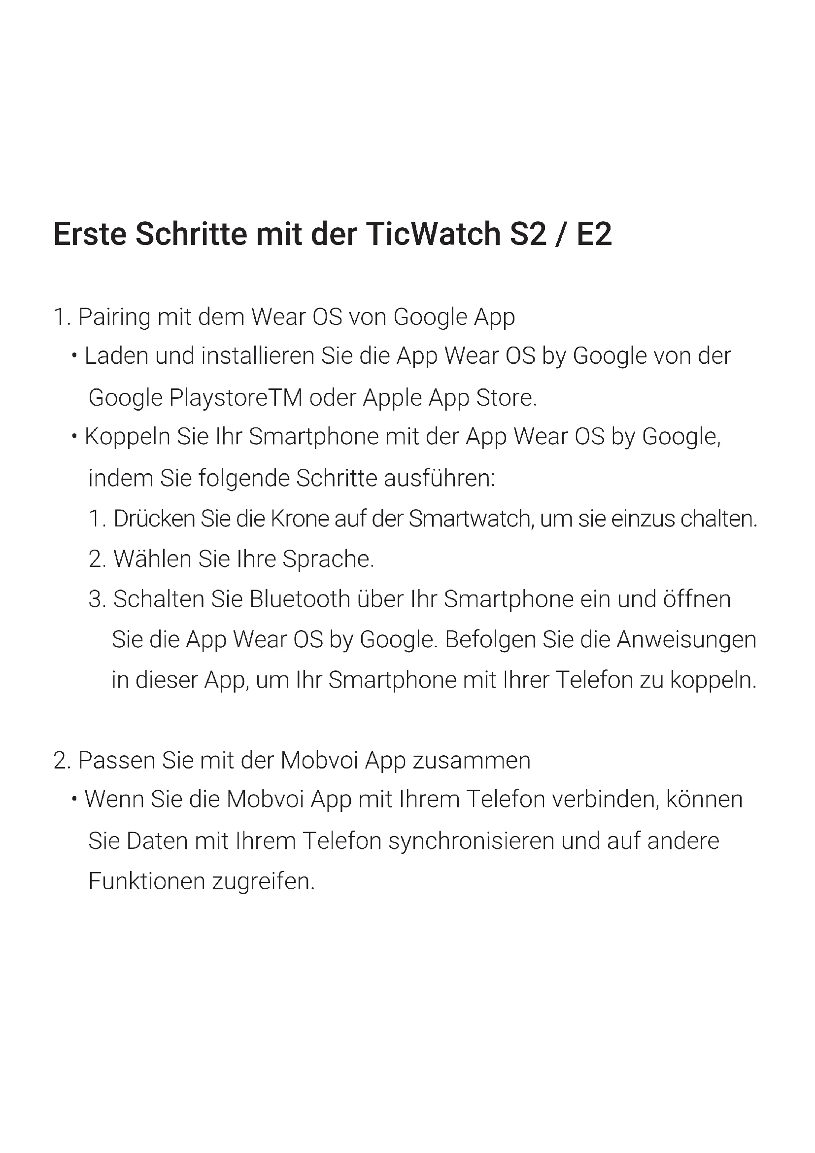 - Wenn Sie die Mobvoi App mit Ihrem Telefon verbinden, können Sie Daten mit Ihrem Telefon synchronisieren und auf andere Funktionen zugreifen.Erste Schritte mit der TicWatch S2 / E2