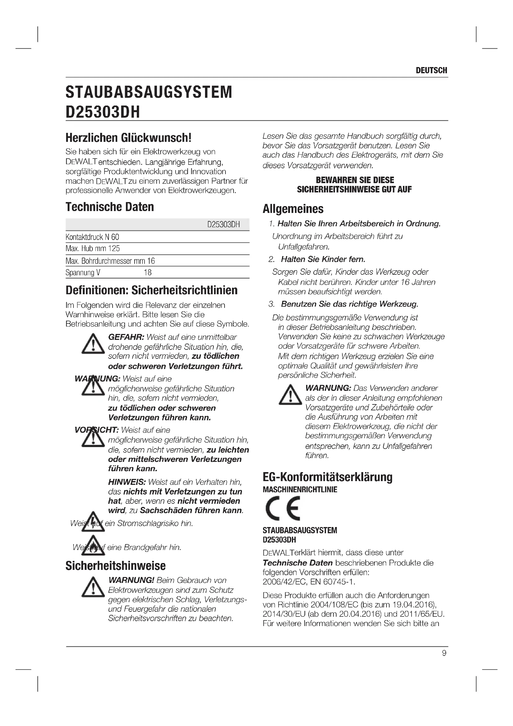 Die bestimmungsgemäße Verwendung ist in dieser Betriebsanleitung beschrieben. Verwenden Sie keine zu schwachen Werkzeuge oder Vorsatzgeräte für schwere Arbeiten. Mit dem richtigen Werkzeug erzielen Sie eine optimale Qualität und gewährleisten Ihre persönliche Sicherheit. WARNUNG: Das Verwenden anderer als der in dieser Anleitung empfohlenen Vorsatzgeräte und Zubehörteile oder die Ausführung von Arbeiten mit diesem Elektrowerkzeug, die nicht der bestimmungsgemäßen Verwendung entsprechen, kann zu Unfallgefahren führen. EG-Konformitätserklärung MASCHINENRICHTLINIE STAUBABSAUGSYSTEM D25303DH DeWALT erklärt hiermit, dass diese unter Technische Daten beschriebenen Produkte die folgenden Vorschriften erfüllen: 2006/42/EC, EN 60745-1. Diese Produkte erfüllen auch die Anforderungen von Richtlinie 2004/108/EC (bis zum 19.04.2016), 2014/30/EU (ab dem 20.04.2016) und 2011/65/EU. Für weitere Informationen wenden Sie sich bitte an Herzlichen Glückwunsch! Sie haben sich für ein Elektrowerkzeug von DeWALT entschieden. Langjährige Erfahrung, sorgfältige Produktentwicklung und Innovation machen DeWALT zu einem zuverlässigen Partner für professionelle Anwender von Elektrowerkzeugen. Technische Daten D25303DH Kontaktdruck N 60 Max. Hub mm 125 Max. Bohrdurchmesser mm 16 Spannung V 18 Definitionen: Sicherheitsrichtlinien Im Folgenden wird die Relevanz der einzelnen Warnhinweise erklärt. Bitte lesen Sie die Betriebsanleitung und achten Sie auf diese Symbole. GEFAHR: Weist auf eine unmittelbar drohende gefährliche Situation hin, die, sofern nicht vermieden, zu tödlichen oder schweren Verletzungen führt. WARNUNG: Weist auf eine möglicherweise gefährliche Situation hin, die, sofern nicht vermieden, zu tödlichen oder schweren Verletzungen führen kann. VORSICHT: Weist auf eine möglicherweise gefährliche Situation hin, die, sofern nicht vermieden, zu leichten oder mittelschweren Verletzungen führen kann. HINWEIS: Weist auf ein Verhalten hin, das nichts mit Verletzungen zu tun hat, aber, wenn es nicht vermieden wird, zu Sachschäden führen kann. Weist auf ein Stromschlagrisiko hin. Weist auf eine Brandgefahr hin. Sicherheitshinweise WARNUNG! Beim Gebrauch von Elektrowerkzeugen sind zum Schutz gegen elektrischen Schlag, Verletzungs- und Feuergefahr die nationalen Sicherheitsvorschriften zu beachten. STAUBABSAUGSYSTEM D25303DH Deutsch (übersetzt von den originalanweisungen)10 Deutsch Restrisiken Bei der Verwendung des Staubabsaugsystems bestehen folgende Risiken: – Verletzungen durch Berühren von beweglichen oder heißen Werkzeugteilen Trotz Beachtung der geltenden Sicherheitsvorschriften und des Einsatzes von Schutzvorrichtungen können bestimmte Risiken nicht vermieden werden. Diese sind: – Schwerhörigkeit. – Quetschungen an den Fingern beim Austausch von Zubehörteilen. – Gesundheitsgefahren durch Einatmen von Staub bei der Arbeit mit Beton und/oder Mauerwerk. Markierungen auf dem Staubabsaugsystem Die folgenden Bildzeichen sind am Gerät sichtbar angebracht: Vor der Verwendung die Betriebsanleitung lesen.