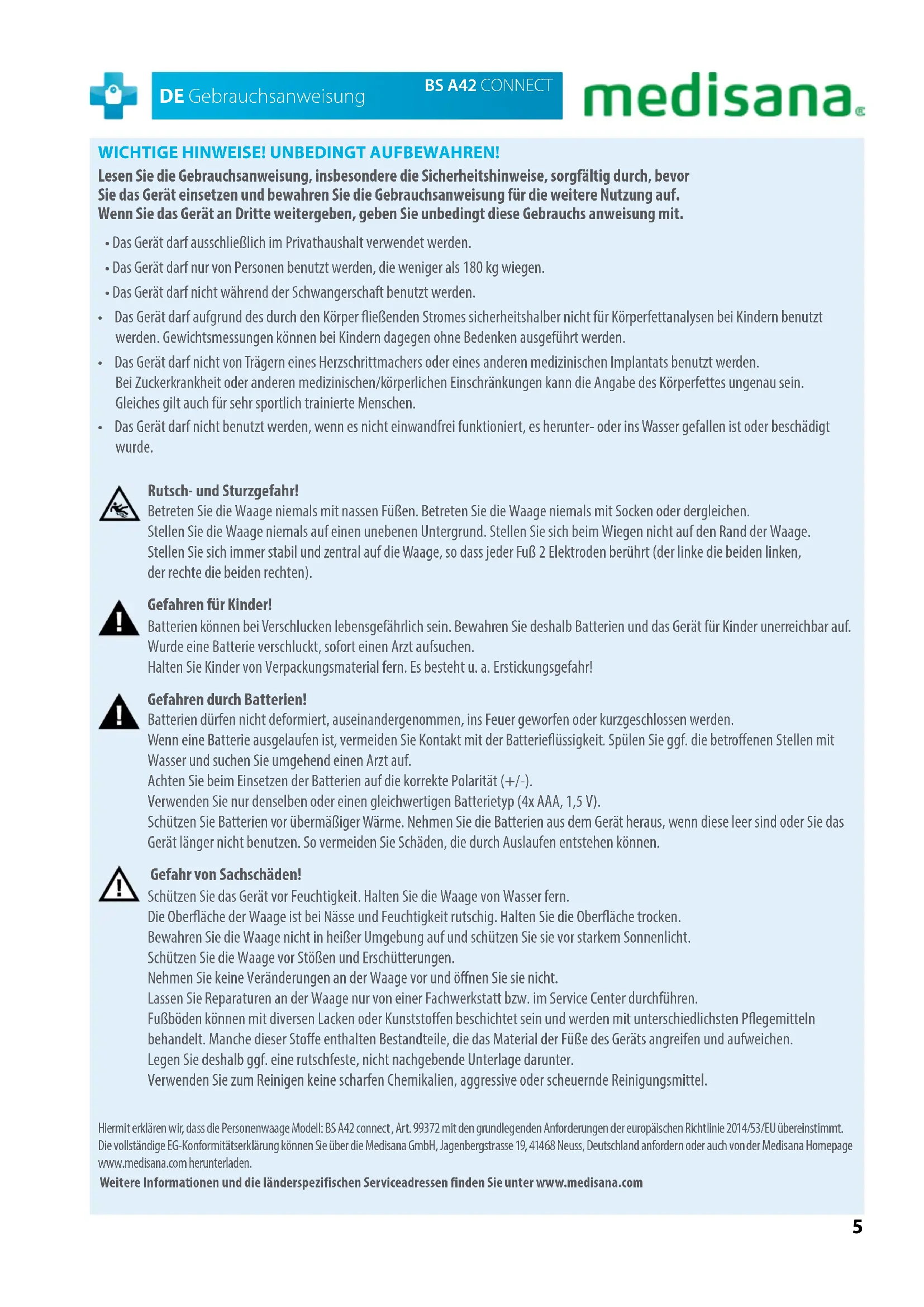 - Das Gerät darf nicht benutzt werden, wenn es nicht einwandfrei funktioniert, es herunter- oder ins Wasser gefallen ist oder beschädigt wurde. Rutsch- und Sturzgefahr! Betreten Sie die Waage niemals mit nassen Füßen. Betreten Sie die Waage niemals mit Socken oder dergleichen. Stellen Sie die Waage niemals auf einen unebenen Untergrund. Stellen Sie sich beim Wiegen nicht auf den Rand der Waage. Stellen Sie sich immer stabil und zentral auf die Waage, so dass jeder Fuß 2 Elektroden berührt (der linke die beiden linken, der rechte die beiden rechten). Gefahren für Kinder! Batterien können bei Verschlucken lebensgefährlich sein. Bewahren Sie deshalb Batterien und das Gerät für Kinder unerreichbar auf. Wurde eine Batterie verschluckt, sofort einen Arzt aufsuchen. Halten Sie Kinder von Verpackungsmaterial fern. Es besteht u. a. Erstickungsgefahr! Gefahren durch Batterien! Batterien dürfen nicht deformiert, auseinandergenommen, ins Feuer geworfen oder kurzgeschlossen werden. Wenn eine Batterie ausgelaufen ist, vermeiden Sie Kontakt mit der Batterieüssigkeit. Spülen Sie ggf. die betroenen Stellen mit Wasser und suchen Sie umgehend einen Arzt auf. Achten Sie beim Einsetzen der Batterien auf die korrekte Polarität (+/-). Verwenden Sie nur denselben oder einen gleichwertigen Batterietyp (4x AAA, 1,5 V). Schützen Sie Batterien vor übermäßiger Wärme. Nehmen Sie die Batterien aus dem Gerät heraus, wenn diese leer sind oder Sie das Gerät länger nicht benutzen. So vermeiden Sie Schäden, die durch Auslaufen entstehen können. Gefahr von Sachschäden! Schützen Sie das Gerät vor Feuchtigkeit. Halten Sie die Waage von Wasser fern. Die Oberäche der Waage ist bei Nässe und Feuchtigkeit rutschig. Halten Sie die Oberäche trocken. Bewahren Sie die Waage nicht in heißer Umgebung auf und schützen Sie sie vor starkem Sonnenlicht. Schützen Sie die Waage vor Stößen und Erschütterungen. Nehmen Sie keine Veränderungen an der Waage vor und önen Sie sie nicht. Lassen Sie Reparaturen an der Waage nur von einer Fachwerkstatt bzw. im Service Center durchführen. Fußböden können mit diversen Lacken oder Kunststoen beschichtet sein und werden mit unterschiedlichsten Pegemitteln behandelt. Manche dieser Stoe enthalten Bestandteile, die das Material der Füße des Geräts angreifen und aufweichen. Legen Sie deshalb ggf. eine rutschfeste, nicht nachgebende Unterlage darunter. Verwenden Sie zum Reinigen keine scharfen Chemikalien, aggressive oder scheuernde Reinigungsmittel. Hiermit erklären wir, dassdiePersonenwaageModell:BS A42 connect , Art. 99372 mit den grundlegenden Anforderungen der europäischenRichtlinie 2014/53/EUübereinstimmt. Die vollständige EG-Konformitätserklärung können Sieüber die Medisana GmbH, Jagenbergstrasse 19,41468 Neuss, Deutschland anfordern oderauchvon derMedisana Homepage www.medisana.com herunterladen. Weitere Informationen und die länderspezifischen Serviceadressen finden Sie unter www.medisana.com6