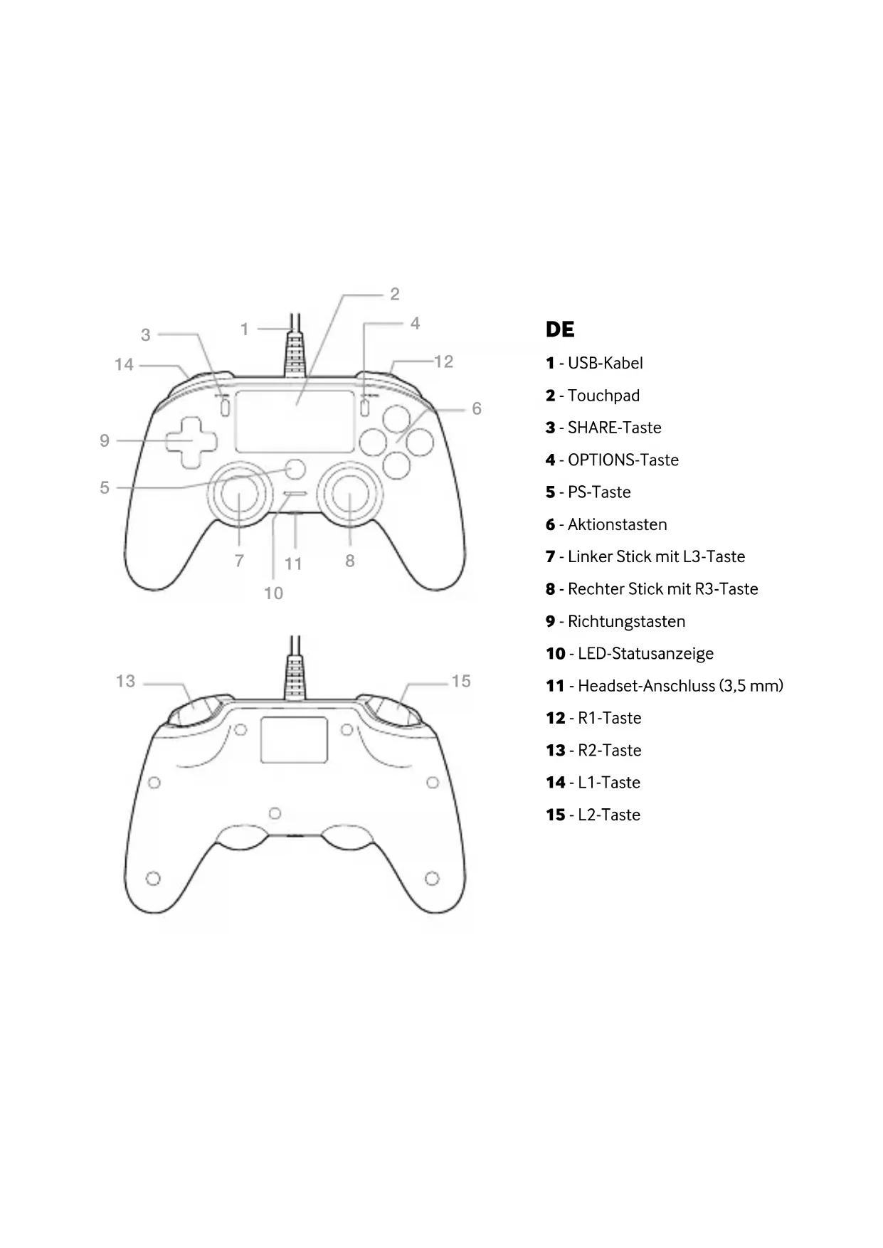 Vielen Dank für Ihren Kauf des NACON WIRED COMPACT CONTROLLERs für das PS4™. Dieses Produkt wurde entwickelt, um Ihr Spielerlebnis zu verbessern. Bitte bewahren Sie diese Bedienungsanleitung als Referenz auf. Falls Sie Hilfe benötigen, kontaktieren Sie bitte den technischen Support. GARANTIE Dieses Produkt mit dem Markenzeichen von NACON verfügt über eine Garantie vom Hersteller für die Dauer von 2 Jahren ab Kaufdatum und wird in diesem Zeitraum gratis durch dasselbe oder ein ähnliches Modell nach unserer Wahl ersetzt, wenn es aufgrund von Materialfehlern oder Verarbeitung einen Defekt aufweist. Diese Garantie deckt keine Defekte ab, die aus Unfallschäden, falscher Handhabung oder Abnutzung entstehen und wird nur dem Originalkäufer des Produkts gewährt. Dies hat keinen Einuss auf Ihre gesetzlichen Rechte. VERWENDUNG Verbinden Sie den WIRED COMPACT CONTROLLER mit einem freien USB-Anschluss an Ihrer Konsole. Hinweis: Bitte beachten Sie, dass dieser Controller die folgenden Funktionen des DUALSHOCK®4 Wireless-Controllers nicht unterstützt: integrierter Lautsprecher, Lichtleiste und SIXAXIS™ Bewegungssensor. Zur Verbesserung der Nutzbarkeit dieses Produkts könnten Firmware Updates auf unserer Website www.nacongaming.com verfügbar sein. Deshalb sollte die Website regelmäßig besucht werden. Dieser Controller kann auch für Windows®-PCs