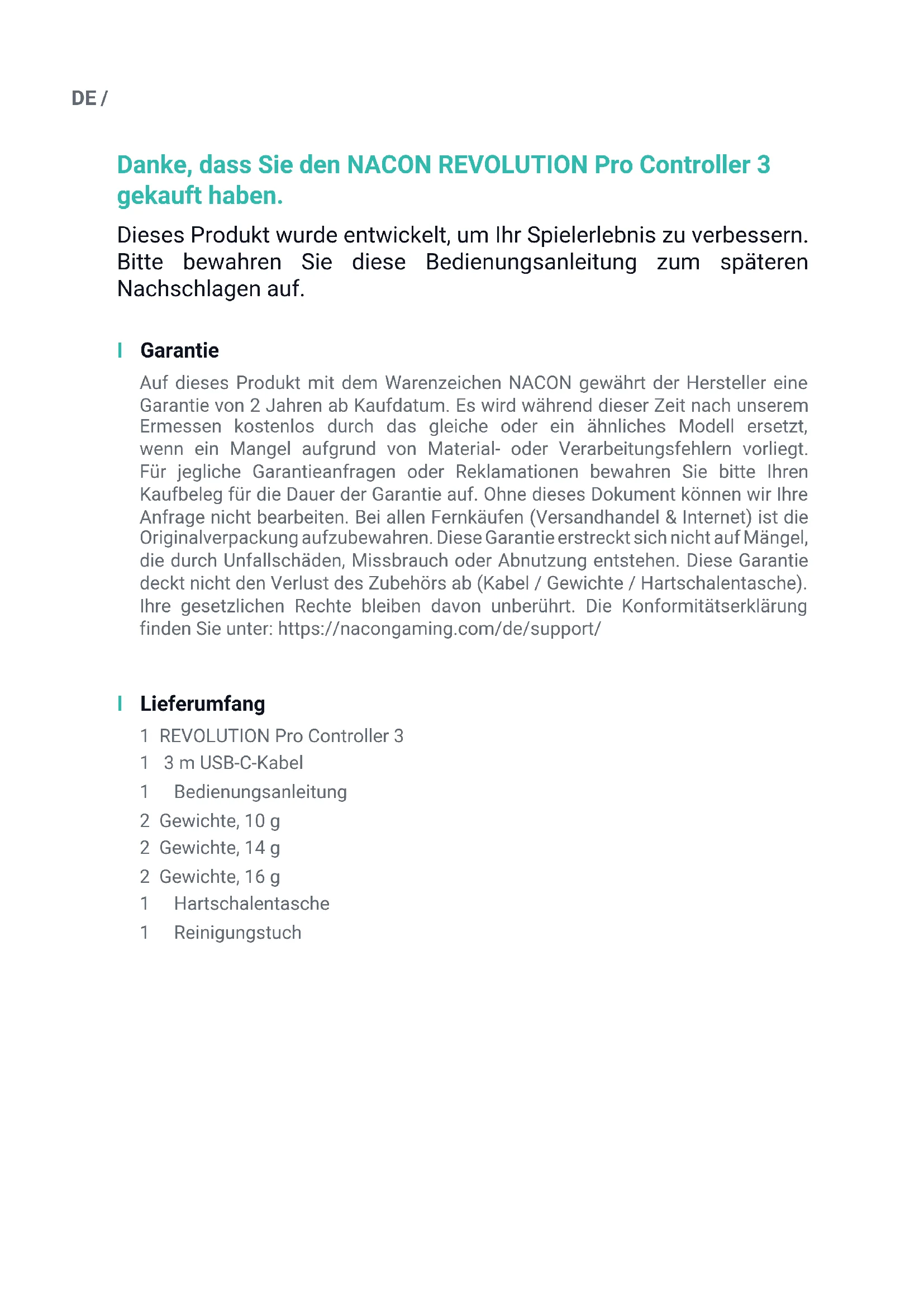 Arcade (sofortiges Ansprechen des Sticks)DE / Recycling Dieses Produkt sollte nicht im normalen Hausmüll entsorgt werden. Bitte bringen Sie es zu einer benannten Sammelstelle. Recycling ist wichtig und trägt dazu bei, unsere Umwelt durch die Reduzierung von Deponieabfällen zu schützen. Nur EU und Türkei. I Wichtige Sicherheitshinweise und Vorsichtsmaßnahmen 1/ Das Produkt ist ausschließlich für den Gebrauch in Innenräumen bestimmt. Setzen Sie das Gerät niemals direktem Sonnenlicht oder feuchtem Wetter aus. 2/ Setzen Sie das Produkt nicht Spritzwasser, Tropfen, Regen oder Feuchtigkeit aus. Tauchen Sie es nicht in Flüssigkeiten. 3/ Nicht Staub, hoher Luftfeuchtigkeit, hohen Temperaturen oder mechanischer Krafteinwirkung aussetzen. 4/ Verwenden oder öffnen Sie das Gerät nicht, wenn es beschädigt ist. Versuchen Sie nicht, es zu reparieren. 5/ Verwenden Sie zur äußerlichen Reinigung nur ein weiches, sauberes und ange- feuchtetes Tuch. Die Verwendung von Reinigungsmitteln kann die Oberfläche beschädigen und zu Undichtigkeiten im Inneren führen. 6/ Tragen Sie das Produkt niemals am Kabel. 7/ Dieses Gerät ist nicht dafür ausgelegt, von Kindern oder von Menschen mit beeinträchtigter körperlicher, sensorischer oder geistiger Leistungsfähigkeit oder von jemandem ohne entsprechende Erfahrung oder Kenntnisse verwen- det zu werden, es sei denn, sie haben vorher eine Anleitung oder Anweisungen zur Verwendung dieses Geräts von jemandem erhalten, der für ihre Sicherheit verantwortlich ist. Lassen Sie das Gerät nicht unbeaufsichtigt und bewahren Sie das Gerät außer Reichweite von Kindern auf. Nicht geeignet für Kinder unter 7 Jahren, da sich das Kabel um den Hals wickeln kann. I Ergonomie Wenn Sie Ihre Hände über eine längere Zeitspanne in der gleichen Position halten, kann dies zu Beschwerden und Schmerzen führen. Sollten diese wiederholt auftreten, wenden Sie sich bitte an Ihren Arzt. Als Vorsichtsmaßnahme empfehlen wir Ihnen, nach jeder Stunde eine 15-minütige Pause einzulegen.DE / I Hilfe bei technischen Fragen Für Auskünfte können Sie sich an die Service-Hotline wenden. Vergewissern Sie sich vor dem Anruf, dass Sie so viele Informationen wie möglich zu dem aufgetretenen Problem und dem Produkt gesammelt haben. Email : support.de@nacongaming.com Website : www.nacongaming.com Tel. : 02271-9047997 Montag bis Freitag (Feiertage ausgenommen): Von 9 bis 18 Uhr Adresse: Bigben Interactive GmbH, Walter-Gropius-Straße 28, 50126 BergheimNL / Bedankt voor de aankoop van de NACON REVOLUTION Pro Controller 3. Dit product is ontworpen om je game-ervaring te verbeteren. Bewaar deze handleiding goed om hem later te kunnen raadplegen. I Garantie Dit product met het handelsmerk NACON heeft een fabrieksgarantie van 2 jaar vanaf het moment van aankoop en zal gedurende deze periode kosteloos worden vervangen voor hetzelfde of een vergelijkbaar model, door ons te bepalen, als er een defect optreedt als gevolg van ondeugdelijk materiaal of productiefouten. Bewaar je aankoopbewijs voor de duur van de garantieperiode voor het geval dat je een beroep op de garantie moet doen. Zonder dit document kunnen we je verzoek niet in behandeling nemen. Voor alle afstandsaankopen (postorder en internet) geldt dat de originele verpakking moet worden bewaard. Deze garantie is niet van toepassing op defecten die het gevolg zijn van opzettelijke schade, onjuist gebruik of slijtage. Deze garantie geldt niet voor verlies van de onderdelen (dongle/kabel/ joystickknoppen/joystickschachten/gewichten/koffer). Dit heeft geen invloed op je wettelijke rechten. Een verklaring van overeenstemming is te vinden op: www.nacongaming.com/support/ I Inhoud 1 x REVOLUTION Pro Controller 3 1 x 3 meter aansluitkabel 1 x Gebruiksaanwijzing 2 x 10g gewichten 2 x 14g gewichten 2 x 16g gewichten 1 x Opbergkoffer 1 x SchoonmaakdoekNL / I Beschrijving van de onderdelen