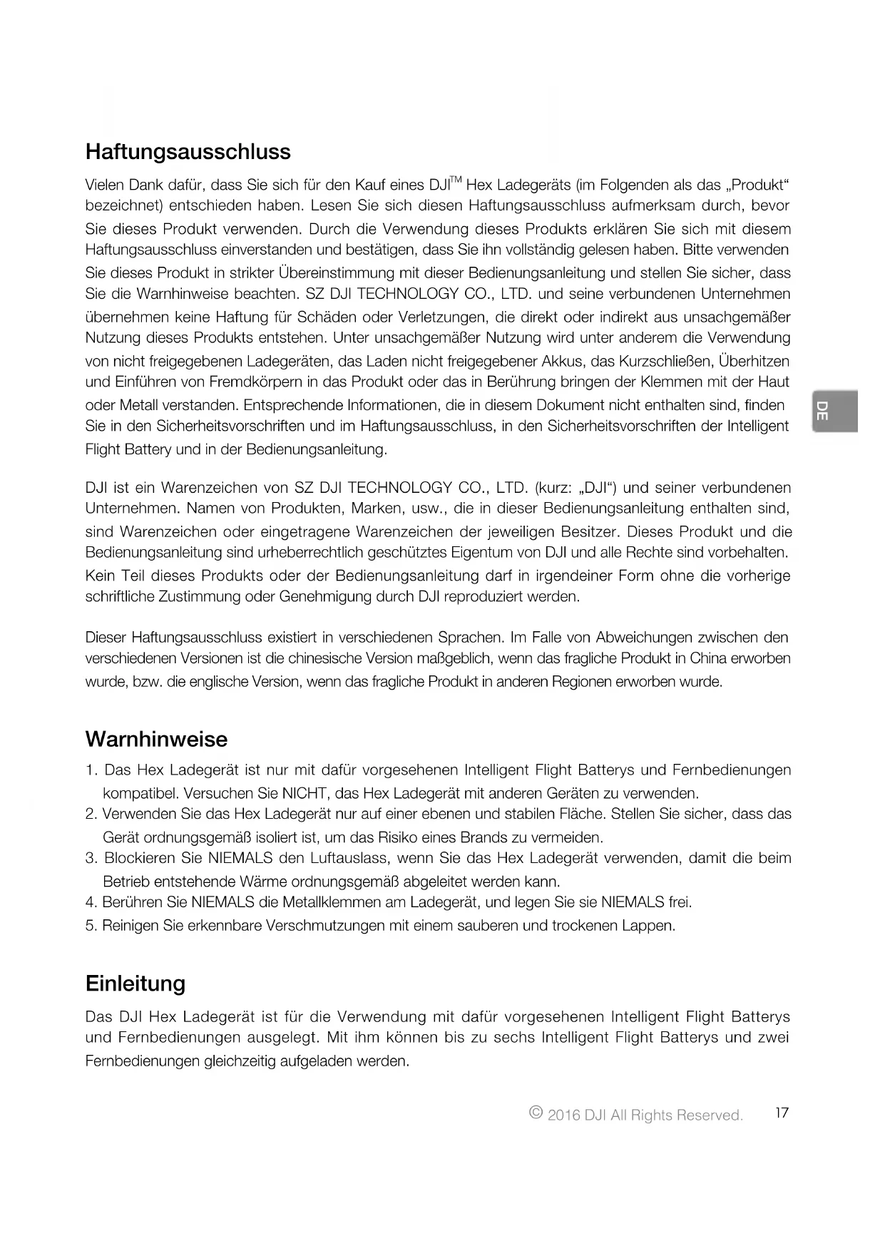Hex Ladegeräts (im Folgenden als das „Produkt“ bezeichnet) entschieden haben. Lesen Sie sich diesen Haftungsausschluss aufmerksam durch, bevor Sie dieses Produkt verwenden. Durch die Verwendung dieses Produkts erklären Sie sich mit diesem Haftungsausschluss einverstanden und bestätigen, dass Sie ihn vollständig gelesen haben. Bitte verwenden Sie dieses Produkt in strikter Übereinstimmung mit dieser Bedienungsanleitung und stellen Sie sicher, dass Sie die Warnhinweise beachten. SZ DJI TECHNOLOGY CO., LTD. und seine verbundenen Unternehmen übernehmen keine Haftung für Schäden oder Verletzungen, die direkt oder indirekt aus unsachgemäßer Nutzung dieses Produkts entstehen. Unter unsachgemäßer Nutzung wird unter anderem die Verwendung von nicht freigegebenen Ladegeräten, das Laden nicht freigegebener Akkus, das Kurzschließen, Überhitzen und Einführen von Fremdkörpern in das Produkt oder das in Berührung bringen der Klemmen mit der Haut oder Metall verstanden. Entsprechende Informationen, die in diesem Dokument nicht enthalten sind, nden Sie in den Sicherheitsvorschriften und im Haftungsausschluss, in den Sicherheitsvorschriften der Intelligent Flight Battery und in der Bedienungsanleitung. DJI ist ein Warenzeichen von SZ DJI TECHNOLOGY CO., LTD. (kurz: „DJI“) und seiner verbundenen Unternehmen. Namen von Produkten, Marken, usw., die in dieser Bedienungsanleitung enthalten sind, sind Warenzeichen oder eingetragene Warenzeichen der jeweiligen Besitzer. Dieses Produkt und die Bedienungsanleitung sind urheberrechtlich geschütztes Eigentum von DJI und alle Rechte sind vorbehalten. Kein Teil dieses Produkts oder der Bedienungsanleitung darf in irgendeiner Form ohne die vorherige schriftliche Zustimmung oder Genehmigung durch DJI reproduziert werden. Dieser Haftungsausschluss existiert in verschiedenen Sprachen. Im Falle von Abweichungen zwischen den verschiedenen Versionen ist die chinesische Version maßgeblich, wenn das fragliche Produkt in China erworben wurde, bzw. die englische Version, wenn das fragliche Produkt in anderen Regionen erworben wurde. Warnhinweise