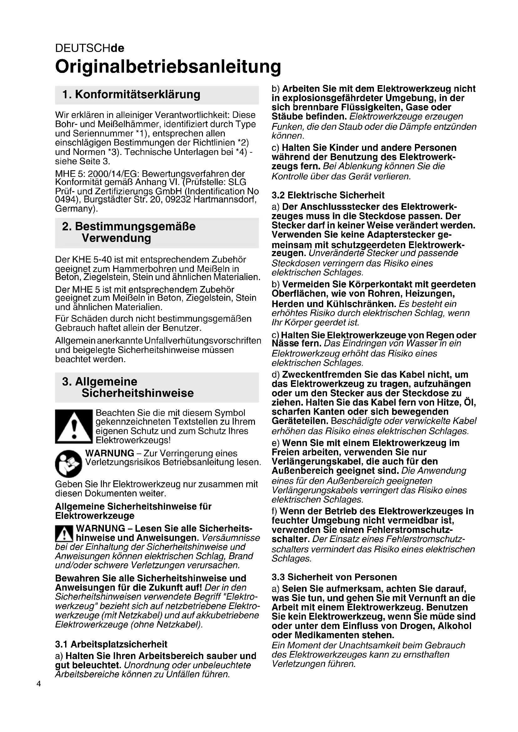 Originalbetriebsanleitung Wir erklären in alleiniger Verantwortlichkeit: Diese Bohr- und Meißelhämmer, identifiziert durch Type und Seriennummer *1), entsprechen allen einschlägigen Bestimmungen der Richtlinien *2) und Normen *3). Technische Unterlagen bei *4) - siehe Seite 3. MHE 5: 2000/14/EG: Bewertungsverfahren der Konformität gemäß Anhang VI. (Prüfstelle: SLG Prüf- und Zertifizierungs GmbH (Indentification No 0494), Burgstädter Str. 20, 09232 Hartmannsdorf, Germany). Der KHE 5-40 ist mit entsprechendem Zubehör geeignet zum Hammerbohren und Meißeln in Beton, Ziegelstein, Stein und ähnlichen Materialien. Der MHE 5 ist mit entsprechendem Zubehör geeignet zum Meißeln in Beton, Ziegelstein, Stein und ähnlichen Materialien. Für Schäden durch nicht bestimmungsgemäßen Gebrauch haftet allein der Benutzer. Allgemein anerkannte Unfallverhütungsvorschriften und beigelegte Sicherheitshinweise müssen beachtet werden. Beachten Sie die mit diesem Symbol gekennzeichneten Textstellen zu Ihrem eigenen Schutz und zum Schutz Ihres Elektrowerkzeugs! WARNUNG – Zur Verringerung eines Verletzungsrisikos Betriebsanleitung lesen. Geben Sie Ihr Elektrowerkzeug nur zusammen mit diesen Dokumenten weiter. Allgemeine Sicherheitshinweise für Elektrowerkzeuge WARNUNG – Lesen Sie alle Sicherheits- hinweise und Anweisungen. Versäumnisse bei der Einhaltung der Sicherheitshinweise und Anweisungen können elektrischen Schlag, Brand und/oder schwere Verletzungen verursachen. Bewahren Sie alle Sicherheitshinweise und Anweisungen für die Zukunft auf! Der in den Sicherheitshinweisen verwendete Begriff "Elektro- werkzeug" bezieht sich auf netzbetriebene Elektro- werkzeuge (mit Netzkabel) und auf akkubetriebene Elektrowerkzeuge (ohne Netzkabel).