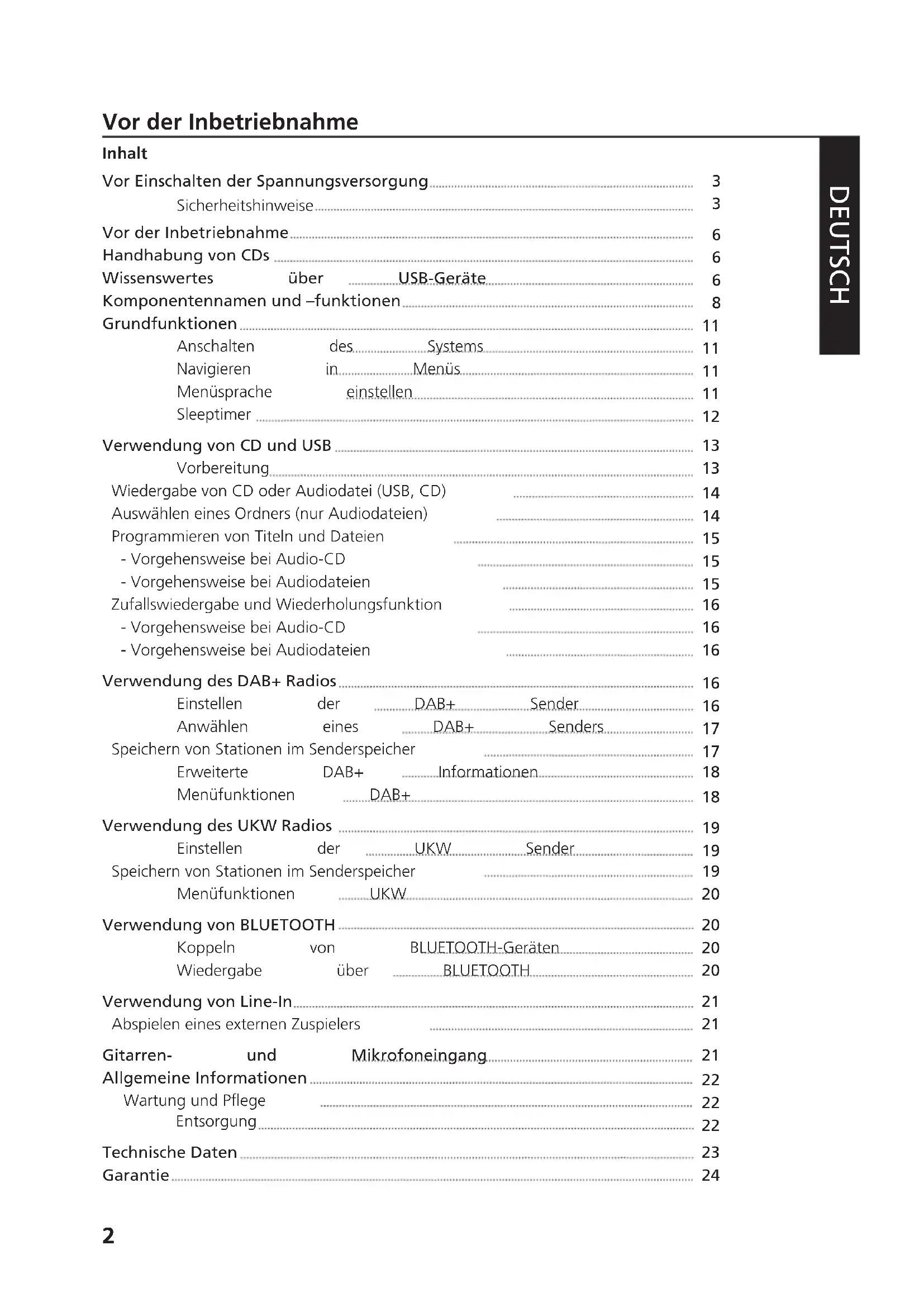 Boomblaster RV-NB200BT RV-NB300DAB BEDIENUNGSANLEITUNG JVCKENWOOD Corporation DEUTSCH FRANÇAIS ITALIANOENGLISH NEDERLANDS22 Vor der Inbetriebnahme DEUTSCH Inhalt Vor Einschalten der Spannungsversorgung Sicherheitshinweise Vor der Inbetriebnahme Handhabung von CDs Wissenswertes über USB-Geräte Komponentennamen und –funktionen Grundfunktionen Anschalten des Systems Navigieren in Menüs Menüsprache einstellen Sleeptimer Verwendung von CD und USB Vorbereitung Wiedergabe von CD oder Audiodatei (USB, CD) Auswählen eines Ordners (nur Audiodateien) Programmieren von Titeln und Dateien - Vorgehensweise bei Audio-CD - Vorgehensweise bei Audiodateien Zufallswiedergabe und Wiederholungsfunktion - Vorgehensweise bei Audio-CD - Vorgehensweise bei Audiodateien Verwendung des DAB+ Radios Einstellen der DAB+ Sender Anwählen eines DAB+ Senders Speichern von Stationen im Senderspeicher Erweiterte DAB+ Informationen Menüfunktionen DAB+ Verwendung des UKW Radios Einstellen der UKW Sender Speichern von Stationen im Senderspeicher Menüfunktionen UKW Verwendung von BLUETOOTH Koppeln von BLUETOOTH-Geräten Wiedergabe über BLUETOOTH Verwendung von Line-In Abspielen eines externen Zuspielers Gitarren- und Mikrofoneingang Allgemeine Informationen WartungundPege Entsorgung Technische Daten Garantie