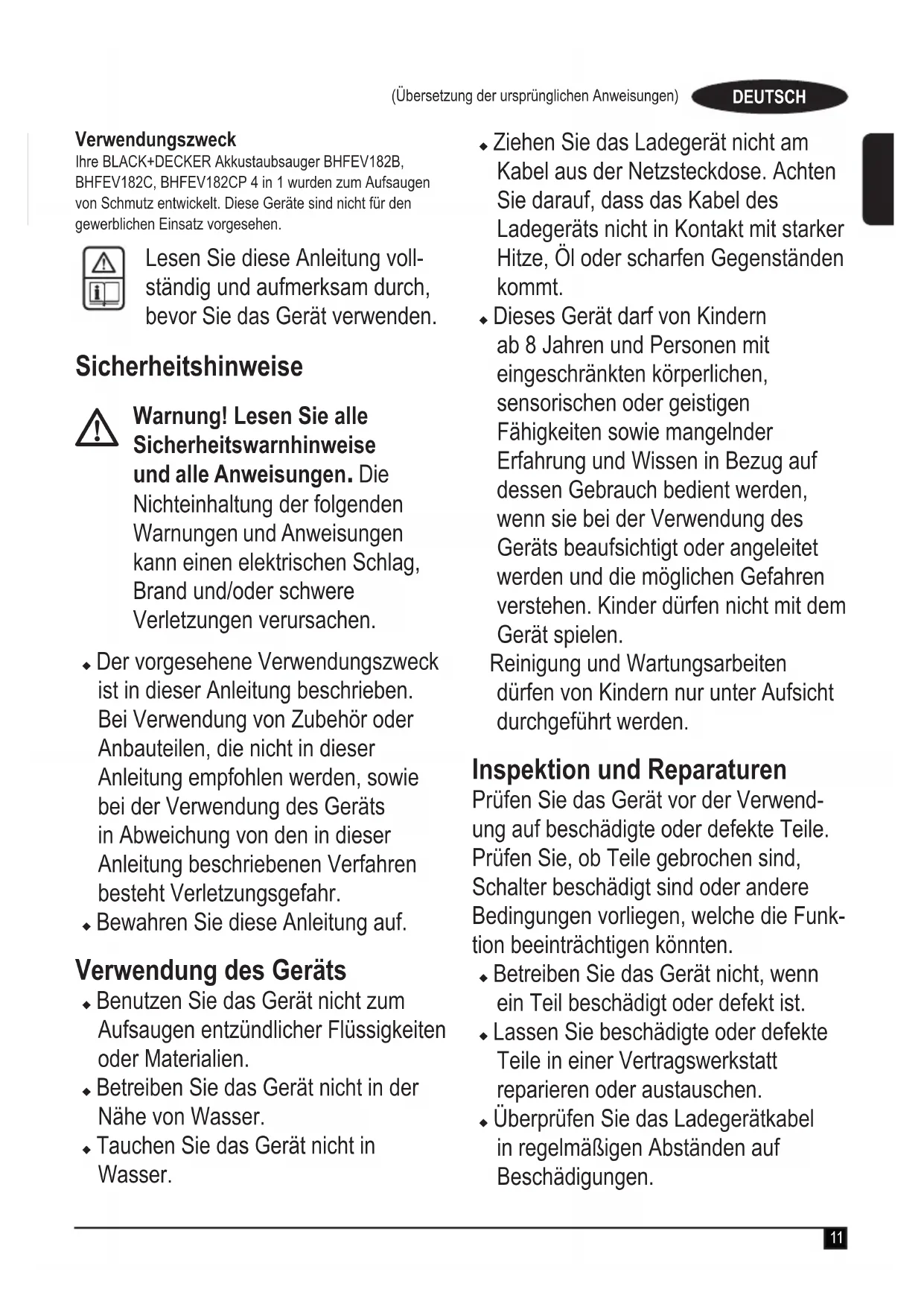 Warnung! Lesen Sie alle Sicherheitswarnhinweise und alle Anweisungen. Die Nichteinhaltung der folgenden Warnungen und Anweisungen kann einen elektrischen Schlag, Brand und/oder schwere Verletzungen verursachen. u Der vorgesehene Verwendungszweck ist in dieser Anleitung beschrieben. Bei Verwendung von Zubehör oder Anbauteilen, die nicht in dieser Anleitung empfohlen werden, sowie bei der Verwendung des Geräts in Abweichung von den in dieser Anleitung beschriebenen Verfahren besteht Verletzungsgefahr. u Bewahren Sie diese Anleitung auf. Verwendung des Geräts u Benutzen Sie das Gerät nicht zum Aufsaugen entzündlicher Flüssigkeiten oder Materialien. u Betreiben Sie das Gerät nicht in der Nähe von Wasser. u Tauchen Sie das Gerät nicht in Wasser. u Ziehen Sie das Ladegerät nicht am Kabel aus der Netzsteckdose. Achten Sie darauf, dass das Kabel des Ladegeräts nicht in Kontakt mit starker Hitze, Öl oder scharfen Gegenständen kommt. u Dieses Gerät darf von Kindern ab 8 Jahren und Personen mit eingeschränkten körperlichen, sensorischen oder geistigen Fähigkeiten sowie mangelnder Erfahrung und Wissen in Bezug auf dessen Gebrauch bedient werden, wenn sie bei der Verwendung des Geräts beaufsichtigt oder angeleitet werden und die möglichen Gefahren verstehen. Kinder dürfen nicht mit dem Gerät spielen. Reinigung und Wartungsarbeiten dürfen von Kindern nur unter Aufsicht durchgeführt werden. Inspektion und Reparaturen Prüfen Sie das Gerät vor der Verwend- ung auf beschädigte oder defekte Teile. Prüfen Sie, ob Teile gebrochen sind, Schalter beschädigt sind oder andere Bedingungen vorliegen, welche die Funk- tion beeinträchtigen könnten. u Betreiben Sie das Gerät nicht, wenn ein Teil beschädigt oder defekt ist. u Lassen Sie beschädigte oder defekte Teile in einer Vertragswerkstatt reparieren oder austauschen. u Überprüfen Sie das Ladegerätkabel in regelmäßigen Abständen auf Beschädigungen.12 (Übersetzung der ursprünglichen Anweisungen) DEUTSCH Tauschen Sie das Ladegerät aus, wenn das Kabel beschädigt oder defekt ist. u Ersetzen oder entfernen Sie keine Teile, für die in dieser Anleitung keine entsprechende Beschreibung enthalten ist. Zusätzliche Sicherheitshinweise Nach dem Gebrauch u Ziehen Sie das Ladegerät aus der Netzsteckdose, bevor Sie das Ladegerät oder die Ladestation reinigen. u Bewahren Sie das Gerät bei Nichtgebrauch an einem trockenen Ort auf. u Kinder sollten keinen Zugang zu aufbewahrten Geräten haben. Restrisiken Beim Gebrauch dieses Geräts verbleiben zusätzliche Restrisiken, die möglicher- weise nicht in den Sicherheitswarnungen genannt werden. Diese Risiken bestehen beispielsweise bei Missbrauch oder längerem Gebrauch. Auch bei der Einhaltung der entspre- chenden Sicherheitsvorschriften und der Verwendung aller Sicherheitsgeräte bestehen weiterhin bestimmte Restrisik- en. Diese sind: u Verletzungen, die durch das Berühren von sich drehenden/bewegenden Teilen verursacht werden. u Verletzungen, die durch das Austauschen von Teilen, Messern oder Zubehör verursacht werden. u Verletzungen, die durch längeren Gebrauch eines Geräts verursacht werden. Legen Sie bei längerem Gebrauch regelmäßige Pausen ein. u Beeinträchtigung des Gehörs.u Gesundheitsrisiken durch das Einatmen von Staub beim Verwenden des Geräts (beispielsweise bei Holzarbeiten, insbesondere Eiche, Buche und MDF.) Ladegeräte Das Ladegerät ist für eine bestimmte Spannung ausgelegt. Stellen Sie sicher, dass die Netzspannung der auf dem Typenschild des Geräts angegebenen Spannung entspricht. Warnung! Ersetzen Sie das Ladegerät keinesfalls durch ein normales Netzkabel. u Verwenden Sie das BLACK+DECKER Ladegerät nur für den Akku des Geräts, mit dem es geliefert wurde. Andere Akkus können platzen und Sachschäden oder Verletzungen verursachen. u Versuchen Sie keinesfalls, nicht auadbare Batterien zu laden. u Bei einer Beschädigung des Netzkabels muss dieses durch den Hersteller oder eine BLACK+DECKER-Vertragswerkstatt ausgetauscht werden, um mögliche Gefahren zu vermeiden. u Achten Sie darauf, dass das Ladegerät nicht mit Wasser in Berührung kommt. u Versuchen Sie nicht, das Ladegerät zu öffnen.13 (Übersetzung der ursprünglichen Anweisungen)DEUTSCHu Nehmen Sie am Ladegerät keine Veränderungen vor. u Beim Laden des Geräts/Akkus muss auf ausreichende Belüftung geachtet werden. Elektrische Sicherheit Symbole auf dem Ladegerät