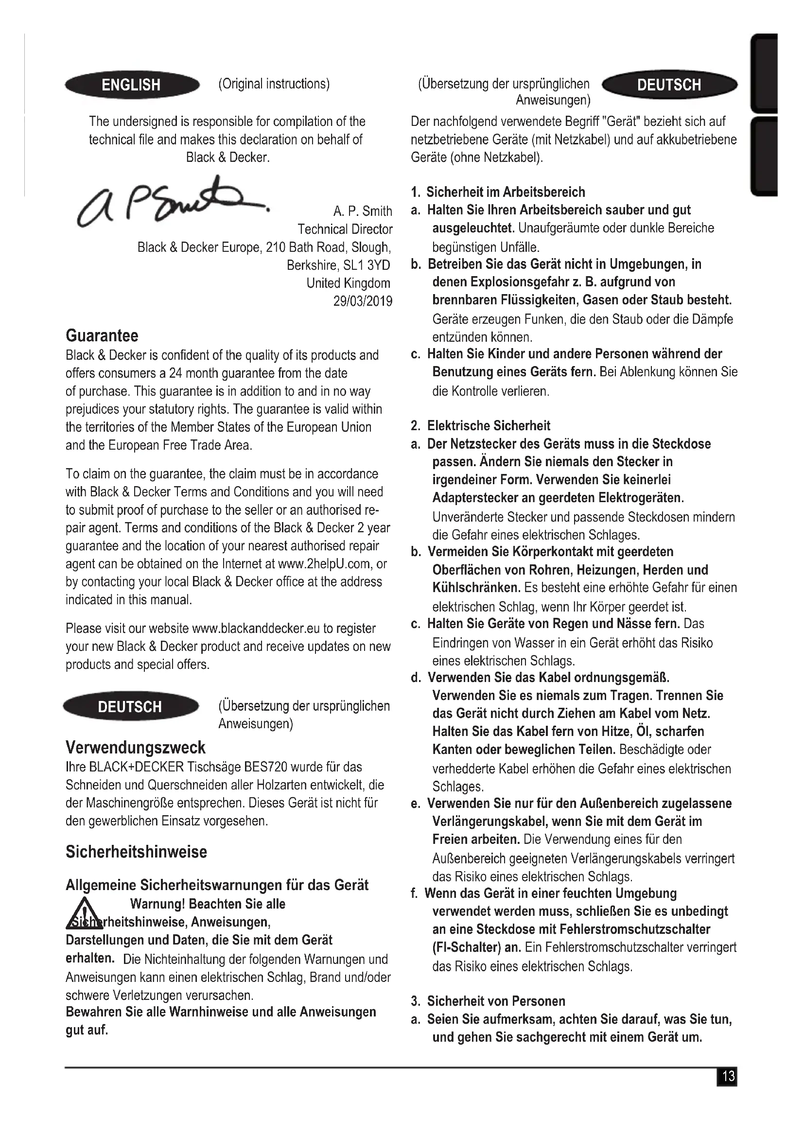 BES720 Tischsäge Black & Decker erklärt, dass die in den technischen Daten beschriebenen Geräte übereinstimmen mit: EN62841-1:2015, EN62841-3-1:2014+A11:2017, Diese Produkte entsprechen außerdem der Richtlinie 2006/42/EC, 2014/30/EU und 2011/65/EU. Weitere Informationen erhalten Sie von Black & Decker unter der folgenden Adresse. Diese bendet sich auch auf der Rückseite dieser Anleitung. Der Unterzeichnete ist verantwortlich für die Zusammenstellung des technischen Dossiers und gibt diese Erklärung im Namen von Black & Decker ab. A. P. Smith Technical Director Black & Decker Europe, 210 Bath Road, Slough, Berkshire, SL1 3YD Vereinigtes Königreich 29/03/2019 Garantie Black & Decker vertraut auf die Qualität der eigenen Geräte und bietet dem Käufer eine außergewöhnliche Garantie von 24 Monaten ab Kaufdatum. Diese Garantie versteht sich unbeschadet der gesetzlichen Gewährleistungsansprüche und schränkt diese keinesfalls ein. Diese Garantie gilt innerhalb der Staatsgebiete der Mitgliedstaaten der Europäischen Union und der Europäischen Freihandelszone. Zur Inanspruchnahme dieser Garantie muss sie den allgemeinen Geschäftsbedingungen von Black & Decker entsprechen und dem Verkäufer bzw. der Vertragswerkstatt ist ein Kaufnachweis vorzulegen. Die Bedingungen für die 2-jährige Garantie von Black & Decker und den Standort Ihrer nächstgelegenen Vertragswerkstatt nden Sie im Internet unter www.2helpU.com oder indem Sie sich an die lokale Black & Decker-Niederlassung wenden, deren Adresse Sie in dieser Anleitung nden. Ihr neues Black & Decker Produkt können Sie auf unserer Website unter www.blackanddecker.eu registrieren. Dort erhalten Sie auch Informationen über neue Produkte und Sonderangebote. Utilisation prévue Votre scie sur table BLACK+DECKER BES720 a été conçue pour scier et scier transversalement tous les types de bois proportionnellement à la taille de la machine. Cet outil est destiné à un usage grand public uniquement. Consignes de sécurité Avertissements de sécurité générale liés aux outils électriques