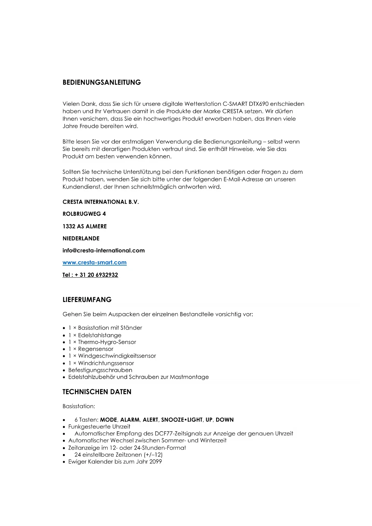 Vielen Dank, dass Sie sich für unsere digitale Wetterstation C-SMART DTX690 entschieden haben und Ihr Vertrauen damit in die Produkte der Marke CRESTA setzen. Wir dürfen Ihnen versichern, dass Sie ein hochwertiges Produkt erworben haben, das Ihnen viele Jahre Freude bereiten wird.