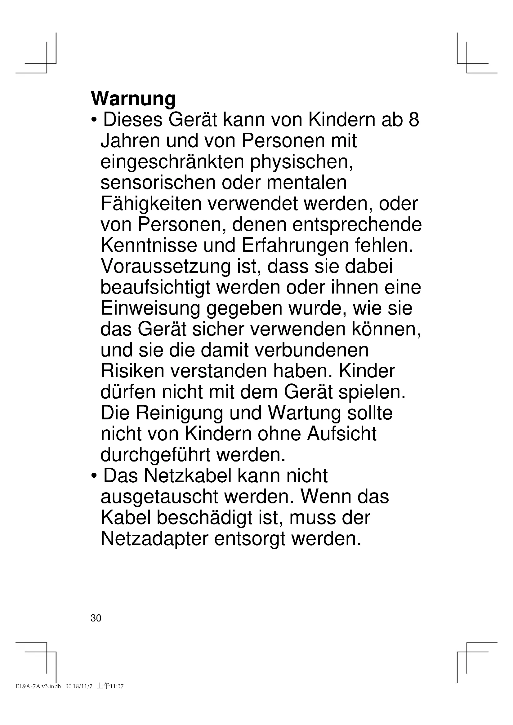 - Das Netzkabel kann nicht ausgetauscht werden. Wenn das Kabel beschädigt ist, muss der Netzadapter entsorgt werden. EL9A-7A v3.indb 30 18/11/7 上午11:3731 GBDFINLEDKPNSFINPLCZSKHROTR