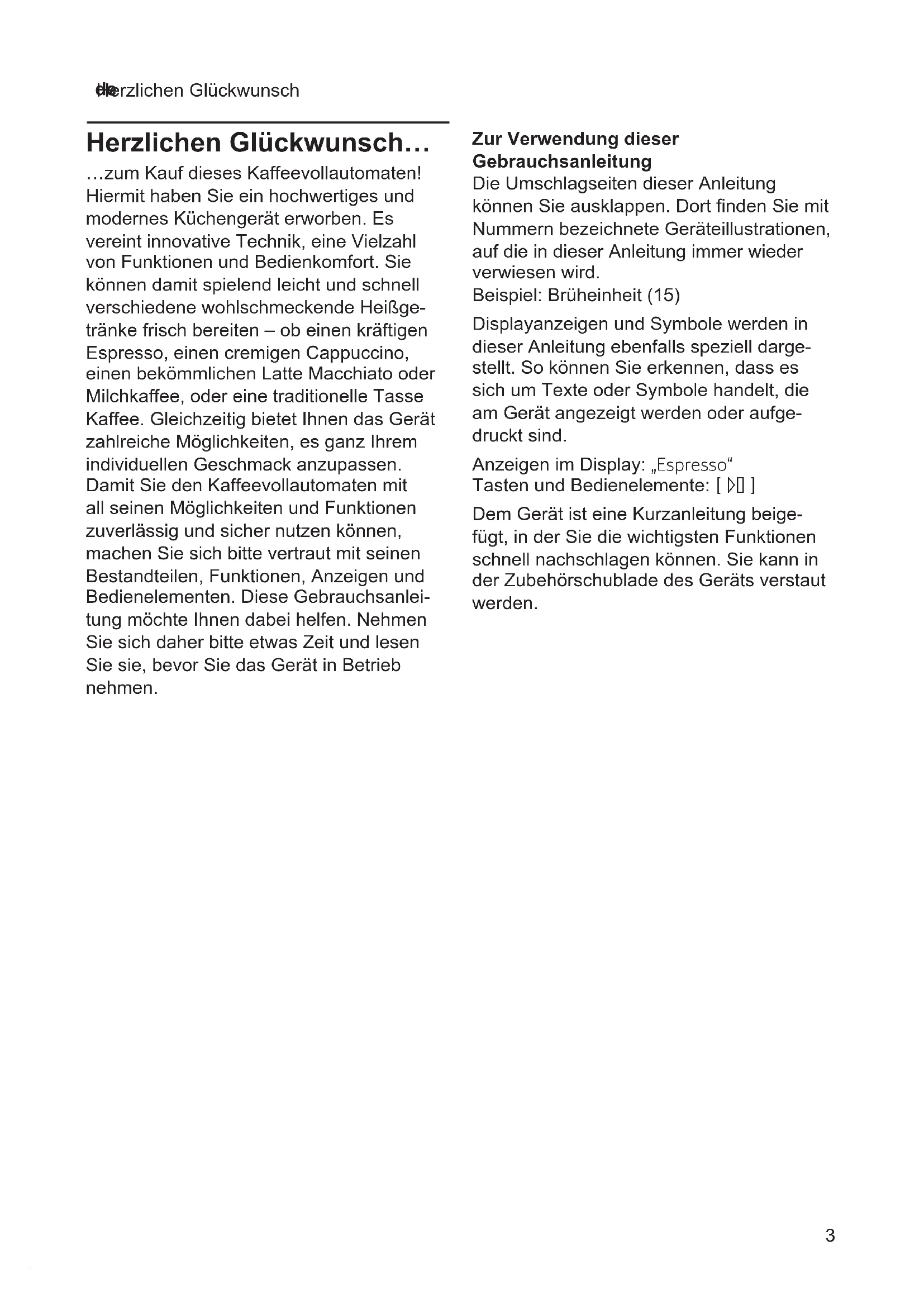 Herzlichen Glückwunsch Herzlichen Glückwunsch… …zum Kauf dieses Kaffeevollautomaten! Hiermit haben Sie ein hochwertiges und modernes Küchengerät erworben Es vereint innovative Technik, eine Vielzahl von Funktionen und Bedienkomfort Sie können damit spielend leicht und schnell verschiedene wohlschmeckende Heißge- tränke frisch bereiten – ob einen kräftigen Espresso, einen cremigen Cappuccino, einen bekömmlichen Latte Macchiato oder Milchkaffee, oder eine traditionelle Tasse Kaffee Gleichzeitig bietet Ihnen das Gerät zahlreiche Möglichkeiten, es ganz Ihrem individuellen Geschmack anzupassen Damit Sie den Kaffeevollautomaten mit all seinen Möglichkeiten und Funktionen zuverlässig und sicher nutzen können, machen Sie sich bitte vertraut mit seinen Bestandteilen, Funktionen, Anzeigen und Bedienelementen Diese Gebrauchsanlei- tung möchte Ihnen dabei helfen Nehmen Sie sich daher bitte etwas Zeit und lesen Sie sie, bevor Sie das Gerät in Betrieb nehmen Zur Verwendung dieser Gebrauchsanleitung Die Umschlagseiten dieser Anleitung können Sie ausklappen. Dort nden Sie mit Nummern bezeichnete Geräteillustrationen, auf die in dieser Anleitung immer wieder verwiesen wird Beispiel: Brüheinheit (15) Displayanzeigen und Symbole werden in dieser Anleitung ebenfalls speziell darge- stellt So können Sie erkennen, dass es sich um Texte oder Symbole handelt, die am Gerät angezeigt werden oder aufge- druckt sind Anzeigen im Display: „Espresso“ Tasten und Bedienelemente: C Dem Gerät ist eine Kurzanleitung beige- fügt, in der Sie die wichtigsten Funktionen schnell nachschlagen können Sie kann in der Zubehörschublade des Geräts verstaut werden4 de Sicherheitshinweise Die Gebrauchsanleitung bitte sorgfältig durchlesen, danach handeln und auf bewahren! Bei Weitergabe des Geräts diese Anleitung beilegen. Dieses Gerät ist für die Verarbeitung haushaltsüblicher Mengen im Haushalt oder in haushaltsähnlichen, nicht-gewerblichen Anwendungen bestimmt. Haushaltsähnliche Anwendungen umfassen z. B. die Verwendung in Mitarbeiterküchen von Läden, Büros, landwirtschaftlichen und anderen gewerblichen Betrieben, sowie die Nutzung durch Gäste von Pensionen, kleinen Hotels und ähnlichen Wohneinrichtungen. W Stromschlaggefahr! Das Gerät darf nur über eine vorschriftsmäßig installierte Steckdose mit Erdung an ein Stromnetz mit Wechselstrom angeschlossen werden Stellen Sie sicher, dass das Schutzleitersystem der elektrischen Hausinstallation vorschriftsmäßig installiert ist Gerät nur gemäß Angaben auf dem Typen schild anschließen und betreiben. Reparaturen am Gerät dürfen nur durch unseren Kundendienst ausgeführt werden, um Gefährdungen zu vermeiden Wenn die Netzanschlussleitung dieses Gerätes beschädigt wird, muss sie durch eine besondere Anschlussleitung ersetzt werden, die bei unserem Kundendienst erhältlich ist Dieses Gerät kann von Kindern ab 8 Jahren und darüber und von Personen mit reduzierten physischen, sensorischen oder mentalen Fähigkeiten oder Mangel an Erfahrung und/oder Wissen benutzt werden, wenn sie beaufsichtigt oder bezüglich des sicheren Gebrauchs des Gerätes unterwiesen wurden und die daraus resultierenden Gefahren verstanden haben Kinder unter 8 Jahren sind vom Gerät und der Anschlussleitung fernzuhalten und dürfen das Gerät nicht bedienen Kinder dürfen nicht mit dem Gerät spielen Das Gerät nur in Innenräumen bei Raumtemperatur und bis zu 2000 m über Meereshöhe verwenden Sicherheitshinweise5