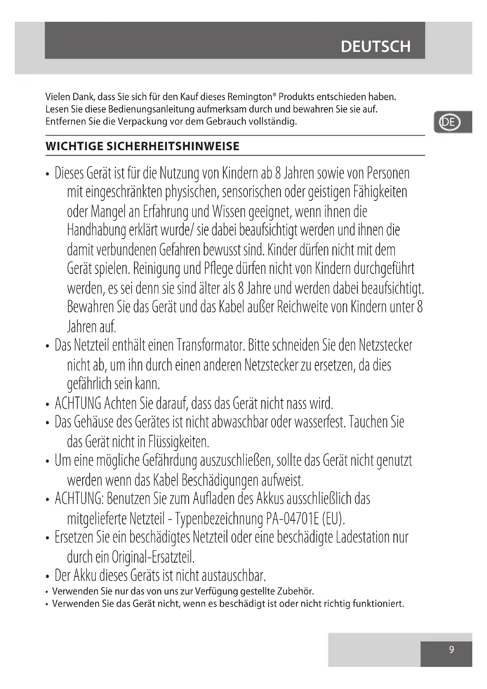 To avoid environmental and health problems due to hazardous substances, appliances and rechargeable and non-rechargeable batteries marked with one of these symbols must not be disposed of with unsorted municipal waste. Always dispose of electrical and electronic products and, where applicable, rechargeable and non-rechargeable batteries, at an appropriate ocial recycling/ collection point. ENGLISH9 Vielen Dank, dass Sie sich für den Kauf dieses Remington® Produkts entschieden haben. Lesen Sie diese Bedienungsanleitung aufmerksam durch und bewahren Sie sie auf. Entfernen Sie die Verpackung vor dem Gebrauch vollständig. WICHTIGE SICHERHEITSHINWEISE