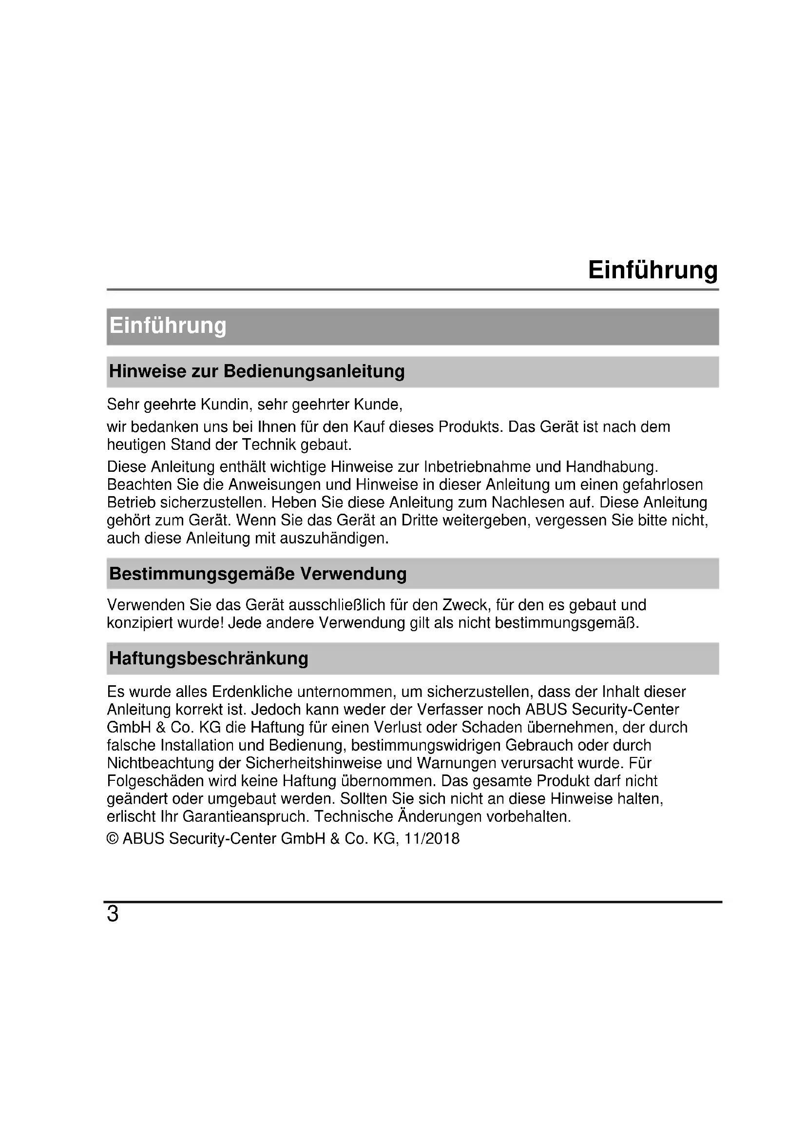 Einführung Hinweise zur Bedienungsanleitung Sehr geehrte Kundin, sehr geehrter Kunde, wir bedanken uns bei Ihnen für den Kauf dieses Produkts. Das Gerät ist nach dem heutigen Stand der Technik gebaut. Diese Anleitung enthält wichtige Hinweise zur Inbetriebnahme und Handhabung. Beachten Sie die Anweisungen und Hinweise in dieser Anleitung um einen gefahrlosen Betrieb sicherzustellen. Heben Sie diese Anleitung zum Nachlesen auf. Diese Anleitung gehört zum Gerät. Wenn Sie das Gerät an Dritte weitergeben, vergessen Sie bitte nicht, auch diese Anleitung mit auszuhändigen. Bestimmungsgemäße Verwendung Verwenden Sie das Gerät ausschließlich für den Zweck, für den es gebaut und konzipiert wurde! Jede andere Verwendung gilt als nicht bestimmungsgemäß. Haftungsbeschränkung Es wurde alles Erdenkliche unternommen, um sicherzustellen, dass der Inhalt dieser Anleitung korrekt ist. Jedoch kann weder der Verfasser noch ABUS Security-Center GmbH & Co. KG die Haftung für einen Verlust oder Schaden übernehmen, der durch falsche Installation und Bedienung, bestimmungswidrigen Gebrauch oder durch Nichtbeachtung der Sicherheitshinweise und Warnungen verursacht wurde. Für Folgeschäden wird keine Haftung übernommen. Das gesamte Produkt darf nicht geändert oder umgebaut werden. Sollten Sie sich nicht an diese Hinweise halten, erlischt Ihr Garantieanspruch. Technische Änderungen vorbehalten. © ABUS Security-Center GmbH & Co. KG, 11/2018Sicherheitshinweise