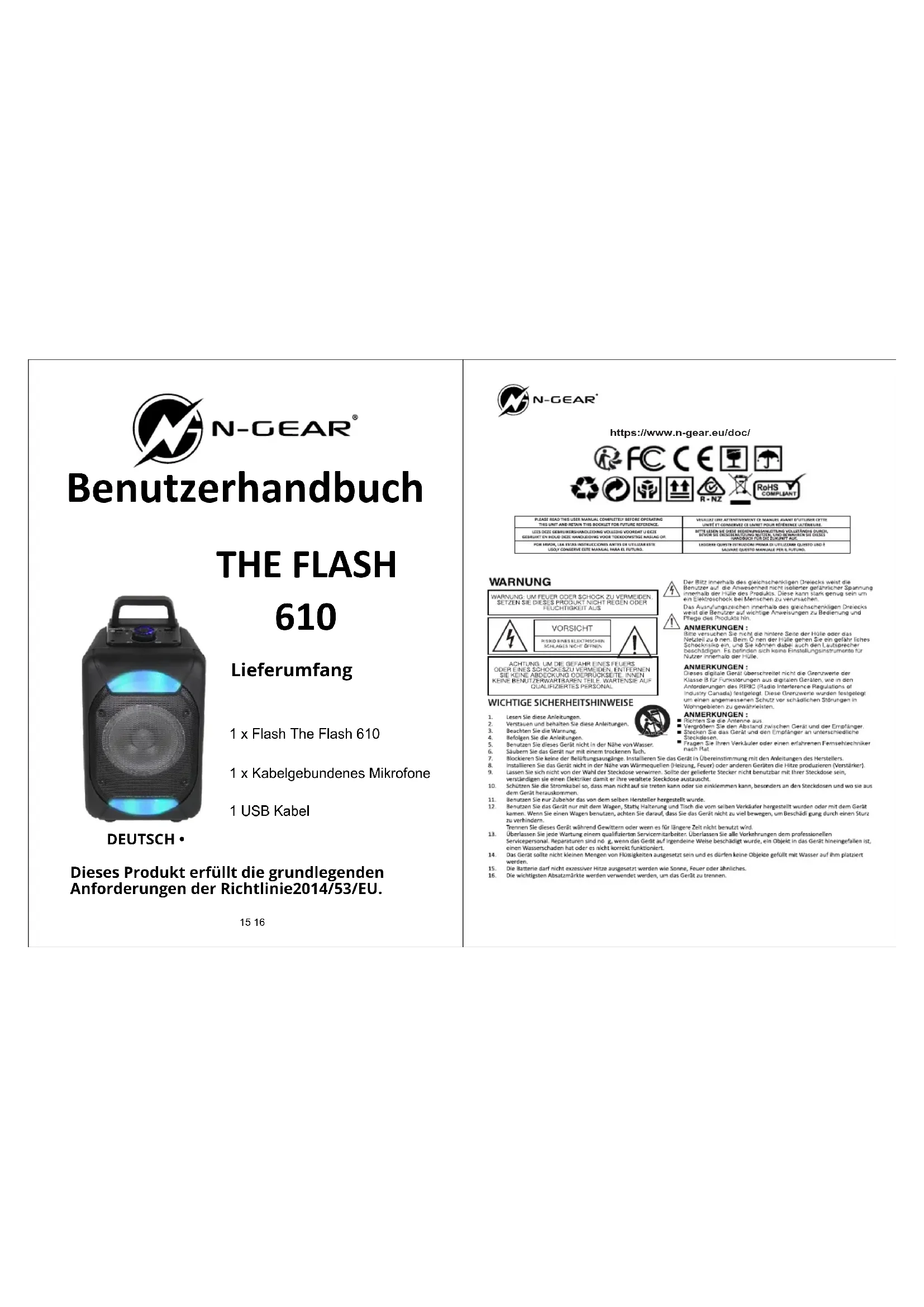 610https://www.n-gear.eu/doc/ DEUTSCH • Lieferumfang Benutzerhandbuch Dieses Produkt erfüllt die grundlegenden Anforderungen der Richtlinie2014/53/EU. THE FLASH