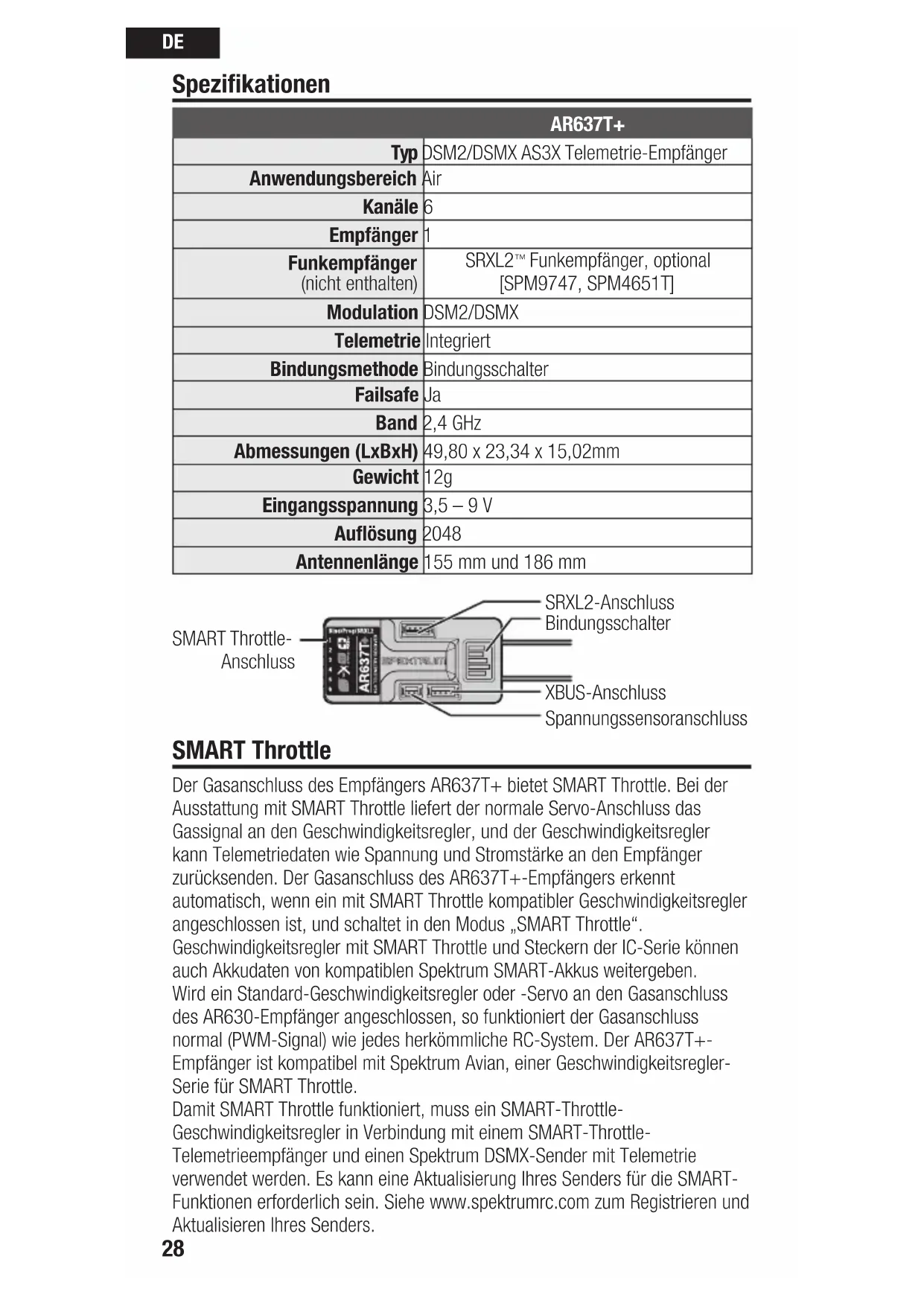 Spezifikationen SMART Throttle Der Gasanschluss des Empfängers AR637T+ bietet SMART Throttle. Bei der Ausstattung mit SMART Throttle liefert der normale Servo-Anschluss das Gassignal an den Geschwindigkeitsregler, und der Geschwindigkeitsregler kann Telemetriedaten wie Spannung und Stromstärke an den Empfänger zurücksenden. Der Gasanschluss des AR637T+-Empfängers erkennt automatisch, wenn ein mit SMART Throttle kompatibler Geschwindigkeitsregler angeschlossen ist, und schaltet in den Modus „SMART Throttle“. Geschwindigkeitsregler mit SMART Throttle und Steckern der IC-Serie können auch Akkudaten von kompatiblen Spektrum SMART-Akkus weitergeben. Wird ein Standard-Geschwindigkeitsregler oder -Servo an den Gasanschluss des AR630-Empfänger angeschlossen, so funktioniert der Gasanschluss normal (PWM-Signal) wie jedes herkömmliche RC-System. Der AR637T+- Empfänger ist kompatibel mit Spektrum Avian, einer Geschwindigkeitsregler- Serie für SMART Throttle. Damit SMART Throttle funktioniert, muss ein SMART-Throttle- Geschwindigkeitsregler in Verbindung mit einem SMART-Throttle- Telemetrieempfänger und einen Spektrum DSMX-Sender mit Telemetrie verwendet werden. Es kann eine Aktualisierung Ihres Senders für die SMART- Funktionen erforderlich sein. Siehe www.spektrumrc.com zum Registrieren und Aktualisieren Ihres Senders. AR637T+ Typ DSM2/DSMX AS3X Telemetrie-Empfänger Anwendungsbereich Air Kanäle 6 Empfänger 1 Funkempfänger (nicht enthalten) SRXL2