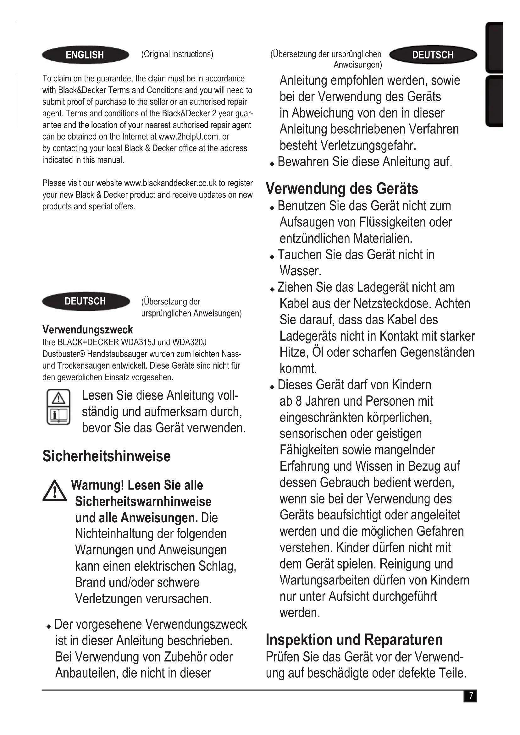 Warnung! Lesen Sie alle Sicherheitswarnhinweise und alle Anweisungen. Die Nichteinhaltung der folgenden Warnungen und Anweisungen kann einen elektrischen Schlag, Brand und/oder schwere Verletzungen verursachen. u Der vorgesehene Verwendungszweck ist in dieser Anleitung beschrieben. Bei Verwendung von Zubehör oder Anbauteilen, die nicht in dieser Anleitung empfohlen werden, sowie bei der Verwendung des Geräts in Abweichung von den in dieser Anleitung beschriebenen Verfahren besteht Verletzungsgefahr. u Bewahren Sie diese Anleitung auf. Verwendung des Geräts u Benutzen Sie das Gerät nicht zum Aufsaugen von Flüssigkeiten oder entzündlichen Materialien. u Tauchen Sie das Gerät nicht in Wasser. u Ziehen Sie das Ladegerät nicht am Kabel aus der Netzsteckdose. Achten Sie darauf, dass das Kabel des Ladegeräts nicht in Kontakt mit starker Hitze, Öl oder scharfen Gegenständen kommt. u Dieses Gerät darf von Kindern ab 8 Jahren und Personen mit eingeschränkten körperlichen, sensorischen oder geistigen Fähigkeiten sowie mangelnder Erfahrung und Wissen in Bezug auf dessen Gebrauch bedient werden, wenn sie bei der Verwendung des Geräts beaufsichtigt oder angeleitet werden und die möglichen Gefahren verstehen. Kinder dürfen nicht mit dem Gerät spielen. Reinigung und Wartungsarbeiten dürfen von Kindern nur unter Aufsicht durchgeführt werden. Inspektion und Reparaturen Prüfen Sie das Gerät vor der Verwend- ung auf beschädigte oder defekte Teile. (Übersetzung der ursprünglichen Anweisungen) DEUTSCH8 (Übersetzung der ursprünglichen Anweisungen) DEUTSCH Prüfen Sie, ob Teile gebrochen sind, Schalter beschädigt sind oder andere Bedingungen vorliegen, die die Funktion beeinträchtigen könnten. u Betreiben Sie das Gerät nicht, wenn Teile beschädigt oder defekt sind. u Lassen Sie beschädigte oder defekte Teile in einer Vertragswerkstatt reparieren oder austauschen. u Überprüfen Sie das Ladegerätkabel in regelmäßigen Abständen auf Beschädigungen. Tauschen Sie das Ladegerät aus, wenn das Kabel beschädigt oder defekt ist. u Ersetzen oder entfernen Sie keine Teile, für die in dieser Anleitung keine entsprechende Beschreibung enthalten ist. Zusätzliche Sicherheitshinweise Nach dem Gebrauch u Trennen Sie das Ladegerät von der Stromversorgung, bevor Sie es reinigen. u Bewahren Sie das Gerät bei Nichtgebrauch an einem trockenen Ort auf. u Kinder sollten keinen Zugang zu aufbewahrten Geräten haben. Restrisiken Beim Gebrauch dieses Geräts verbleiben zusätzliche Restrisiken, die möglicher- weise nicht in den Sicherheitswarnungen genannt werden. Diese Risiken bestehen beispielsweise bei Missbrauch oder längerem Gebrauch. Auch bei der Einhaltung der entspre- chenden Sicherheitsvorschriften und der Verwendung aller Sicherheitsgeräte bestehen weiterhin bestimmte Restrisik- en. Diese sind: u Verletzungen, die durch das Berühren von sich drehenden/bewegenden Teilen verursacht werden. u Verletzungen, die durch das Austauschen von Teilen, Messern oder Zubehör verursacht werden. u Der längere Gebrauch eines Geräts kann Verletzungen zur Folge haben. Legen Sie bei längerem Gebrauch regelmäßige Pausen ein. u Schwerhörigkeit.u Gesundheitsrisiken durch das Einatmen von Staub beim Gebrauch des Geräts (z. B. bei Holzarbeiten, insbesondere Eiche, Buche und Pressspan). Ladegeräte Das Ladegerät ist für eine bestimmte Spannung ausgelegt. Stellen Sie sicher, dass die Netzspannung der auf dem Typenschild des Geräts angegebenen Spannung entspricht. Warnung! Ersetzen Sie das Ladegerät keinesfalls durch ein normales Netzkabel. u Verwenden Sie das BLACK+DECKER Ladegerät nur für den Akku des Geräts, mit dem es geliefert wurde. Andere Akkus können platzen und Sachschäden oder Verletzungen verursachen. u Versuchen Sie keinesfalls, nicht auadbare Batterien zu laden.9 (Übersetzung der ursprünglichen Anweisungen)DEUTSCHu Bei einer Beschädigung des Netzkabels muss dieses durch den Hersteller oder eine BLACK+DECKER Vertragswerkstatt ausgetauscht werden, um mögliche Gefahren zu vermeiden. u Achten Sie darauf, dass das Ladegerät nicht mit Wasser in Berührung kommt. u Versuchen Sie nicht, das Ladegerät zu öffnen. u Nehmen Sie am Ladegerät keine Veränderungen vor. u Während das Gerät/der Akku geladen wird, muss auf ausreichende Belüftung geachtet werden. Elektrische Sicherheit Symbole auf dem Ladegerät Lesen Sie diese Anleitung vollständig und aufmerk- sam durch, bevor Sie das Gerät verwenden.