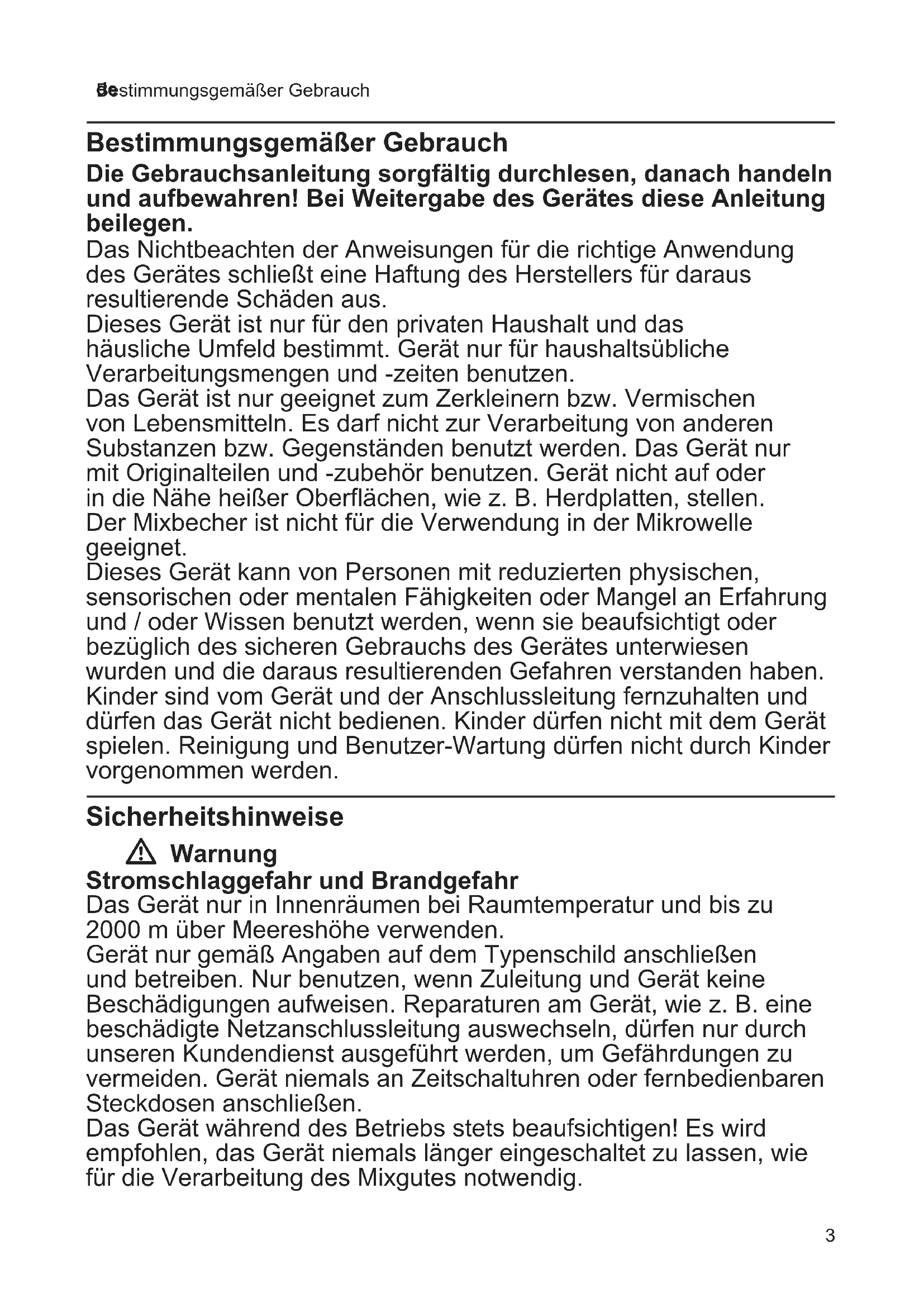 - Bestimmungsgemäßer Gebrauch Bestimmungsgemäßer Gebrauch Die Gebrauchsanleitung sorgfältig durchlesen, danach handeln und aufbewahren! Bei Weitergabe des Gerätes diese Anleitung beilegen. Das Nichtbeachten der Anweisungen für die richtige Anwendung des Gerätes schließt eine Haftung des Herstellers für daraus resultierende Schäden aus. Dieses Gerät ist nur für den privaten Haushalt und das häusliche Umfeld bestimmt. Gerät nur für haushaltsübliche Verarbeitungsmengen und -zeiten benutzen. Das Gerät ist nur geeignet zum Zerkleinern bzw. Vermischen von Lebensmitteln. Es darf nicht zur Verarbeitung von anderen Substanzen bzw. Gegenständen benutzt werden. Das Gerät nur mit Originalteilen und -zubehör benutzen. Gerät nicht auf oder in die Nähe heißer Oberflächen, wie z. B. Herdplatten, stellen. Der Mixbecher ist nicht für die Verwendung in der Mikrowelle geeignet. Dieses Gerät kann von Personen mit reduzierten physischen, sensorischen oder mentalen Fähigkeiten oder Mangel an Erfahrung und / oder Wissen benutzt werden, wenn sie beaufsichtigt oder bezüglich des sicheren Gebrauchs des Gerätes unterwiesen wurden und die daraus resultierenden Gefahren verstanden haben. Kinder sind vom Gerät und der Anschlussleitung fernzuhalten und dürfen das Gerät nicht bedienen. Kinder dürfen nicht mit dem Gerät spielen. Reinigung und Benutzer-Wartung dürfen nicht durch Kinder vorgenommen werden. Sicherheitshinweise W Warnung Stromschlaggefahr und Brandgefahr Das Gerät nur in Innenräumen bei Raumtemperatur und bis zu 2000 m über Meereshöhe verwenden. Gerät nur gemäß Angaben auf dem Typenschild anschließen und betreiben. Nur benutzen, wenn Zuleitung und Gerät keine Beschädigungen aufweisen. Reparaturen am Gerät, wie z. B. eine beschädigte Netzanschlussleitung auswechseln, dürfen nur durch unseren Kundendienst ausgeführt werden, um Gefährdungen zu vermeiden. Gerät niemals an Zeitschaltuhren oder fernbedienbaren Steckdosen anschließen. Das Gerät während des Betriebs stets beaufsichtigen! Es wird empfohlen, das Gerät niemals länger eingeschaltet zu lassen, wie für die Verarbeitung des Mixgutes notwendig.4 de Sicherheitshinweise Herzlichen Glückwunsch zum Kauf Ihres neuen Gerätes aus dem Hause Bosch. Weitere Informationen zu unseren Produkten finden Sie auf unserer Internetseite. Inhalt Bestimmungsgemäßer Gebrauch p. 3