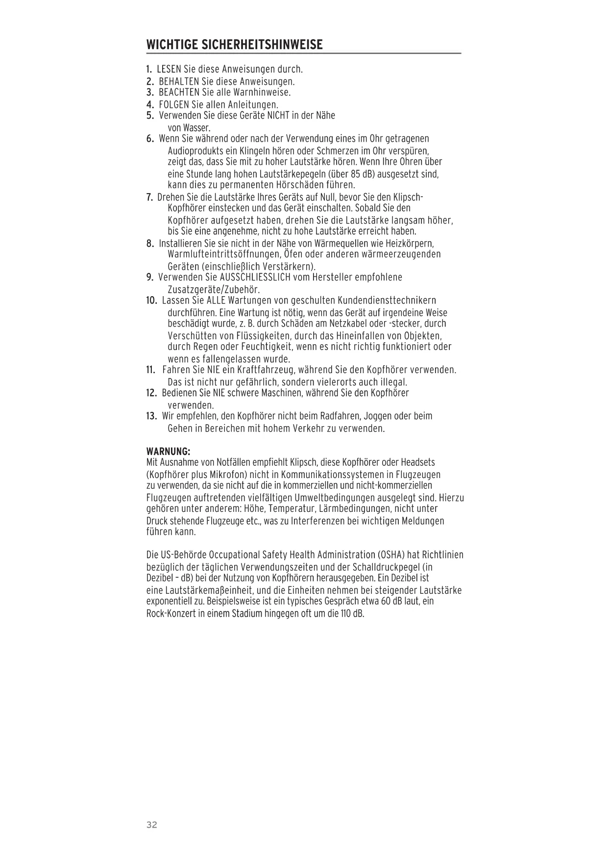 Gehen in Bereichen mit hohem Verkehr zu verwenden. WARNUNG: Mit Ausnahme von Notfällen empfiehlt Klipsch, diese Kopfhörer oder Headsets (Kopfhörer plus Mikrofon) nicht in Kommunikationssystemen in Flugzeugen zu verwenden, da sie nicht auf die in kommerziellen und nicht-kommerziellen Flugzeugen auftretenden vielfältigen Umweltbedingungen ausgelegt sind. Hierzu gehören unter anderem: Höhe, Temperatur, Lärmbedingungen, nicht unter Druck stehende Flugzeuge etc., was zu Interferenzen bei wichtigen Meldungen führen kann. Die US-Behörde Occupational Safety Health Administration (OSHA) hat Richtlinien bezüglich der täglichen Verwendungszeiten und der Schalldruckpegel (in Dezibel – dB) bei der Nutzung von Kopfhörern herausgegeben. Ein Dezibel ist eine Lautstärkemaßeinheit, und die Einheiten nehmen bei steigender Lautstärke exponentiell zu. Beispielsweise ist ein typisches Gespräch etwa 60 dB laut, ein Rock-Konzert in einem Stadium hingegen oft um die 110 dB. WICHTIGE SICHERHEITSHINWEISE33 Schalldruckpegel und empfohlene maximale Nutzungsdauer Pro Tag 90dB 8 Stunden 92dB 6 Stunden 95dB 4 Stunden 97dB 3 Stunden 100dB 2 Stunden 102dB 1.5 Stunden 105dB 1 Stunden 110dB 30 Minuten 115dB Maximal 15 Minuten 120dB Zu vermeiden, da Hörschäden auftreten können