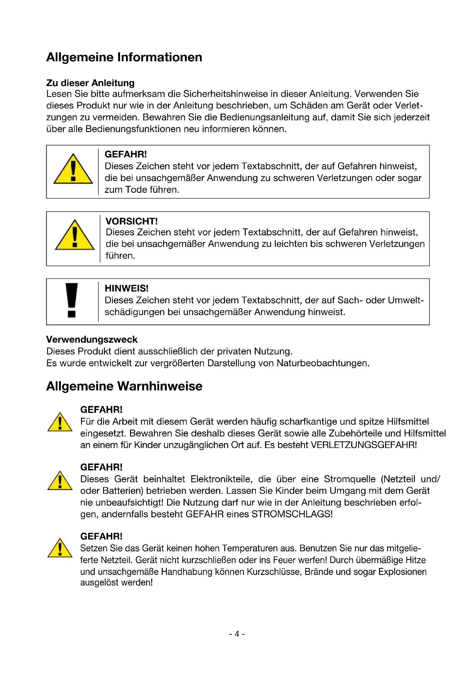1#Allgemeine Informationen Zu dieser Anleitung Lesen Sie bitte aufmerksam die Sicherheitshinweise in dieser Anleitung. Verwenden Sie dieses Produkt nur wie in der Anleitung beschrieben, um Schäden am Gerät oder Verlet- zungen zu vermeiden. Bewahren Sie die Bedienungsanleitung auf, damit Sie sich jederzeit über alle Bedienungsfunktionen neu informieren können. GEFAHR! Dieses Zeichen steht vor jedem Textabschnitt, der auf Gefahren hinweist, die bei unsachgemäßer Anwendung zu schweren Verletzungen oder sogar zum Tode führen. VORSICHT! Dieses Zeichen steht vor jedem Textabschnitt, der auf Gefahren hinweist, die bei unsachgemäßer Anwendung zu leichten bis schweren Verletzungen führen. HINWEIS! Dieses Zeichen steht vor jedem Textabschnitt, der auf Sach- oder Umwelt- schädigungen bei unsachgemäßer Anwendung hinweist. Verwendungszweck Dieses Produkt dient ausschließlich der privaten Nutzung. Es wurde entwickelt zur vergrößerten Darstellung von Naturbeobachtungen. Allgemeine Warnhinweise GEFAHR! Für die Arbeit mit diesem Gerät werden häufig scharfkantige und spitze Hilfsmittel eingesetzt. Bewahren Sie deshalb dieses Gerät sowie alle Zubehörteile und Hilfsmittel an einem für Kinder unzugänglichen Ort auf. Es besteht VERLETZUNGSGEFAHR! GEFAHR! Dieses Gerät beinhaltet Elektronikteile, die über eine Stromquelle (Netzteil und/ oder Batterien) betrieben werden. Lassen Sie Kinder beim Umgang mit dem Gerät nie unbeaufsichtigt! Die Nutzung darf nur wie in der Anleitung beschrieben erfol- gen, andernfalls besteht GEFAHR eines STROMSCHLAGS! GEFAHR! Setzen Sie das Gerät keinen hohen Temperaturen aus. Benutzen Sie nur das mitgelie- ferte Netzteil. Gerät nicht kurzschließen oder ins Feuer werfen! Durch übermäßige Hitze und unsachgemäße Handhabung können Kurzschlüsse, Brände und sogar Explosionen ausgelöst werden! - 4 -DE