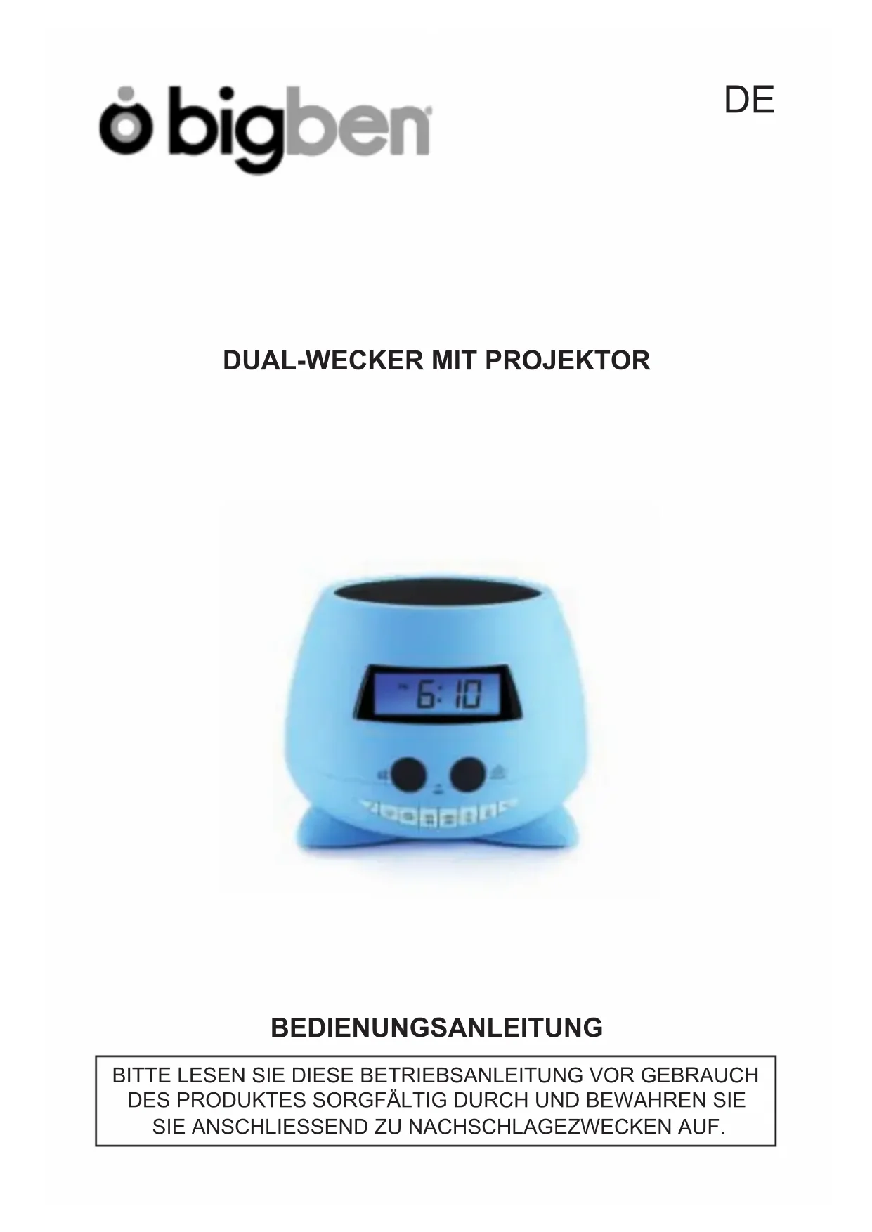 Apenas DC Pilhas:3pilhasalcalinasAALR06(nãoincluídas). CUIDADO: As pilhas só deverão ser colocadas por um adulto. Substitua as pilhas quando o som for reproduzido lentamente ou distorcido, ou quando a unidade funcionar erraticamente.DUAL-WECKER MIT PROJEKTOR BEDIENUNGSANLEITUNG BITTELESENSIEDIESEBETRIEBSANLEITUNGVORGEBRAUCH DESPRODUKTESSORGFÄLTIGDURCHUNDBEWAHRENSIE SIEANSCHLIESSENDZUNACHSCHLAGEZWECKENAUF. DE- DE 1 - Inhalt Erste Schritte 1 Sicherheit und Hinweise Sicherheit Produktpege 2 Umweltschutz Packungsinhalt 3 Batteriestrom Aufstellen Grundfunktionen Tastenfunktionen 4 Ton Ein/Aus 5 Lautstärke Einstellen der Uhrzeit Einstellen der Weckzeit BenutzungderSnooze-Funktion SCHLÄFCHEN-/Schlaf-Timer 6 Ton aufnehmen Projektor und LCD-Hintergrundbeleuchtung EIN/AUS GrundlegendetechnischeDaten 7 Anmerkung Erste Schritte