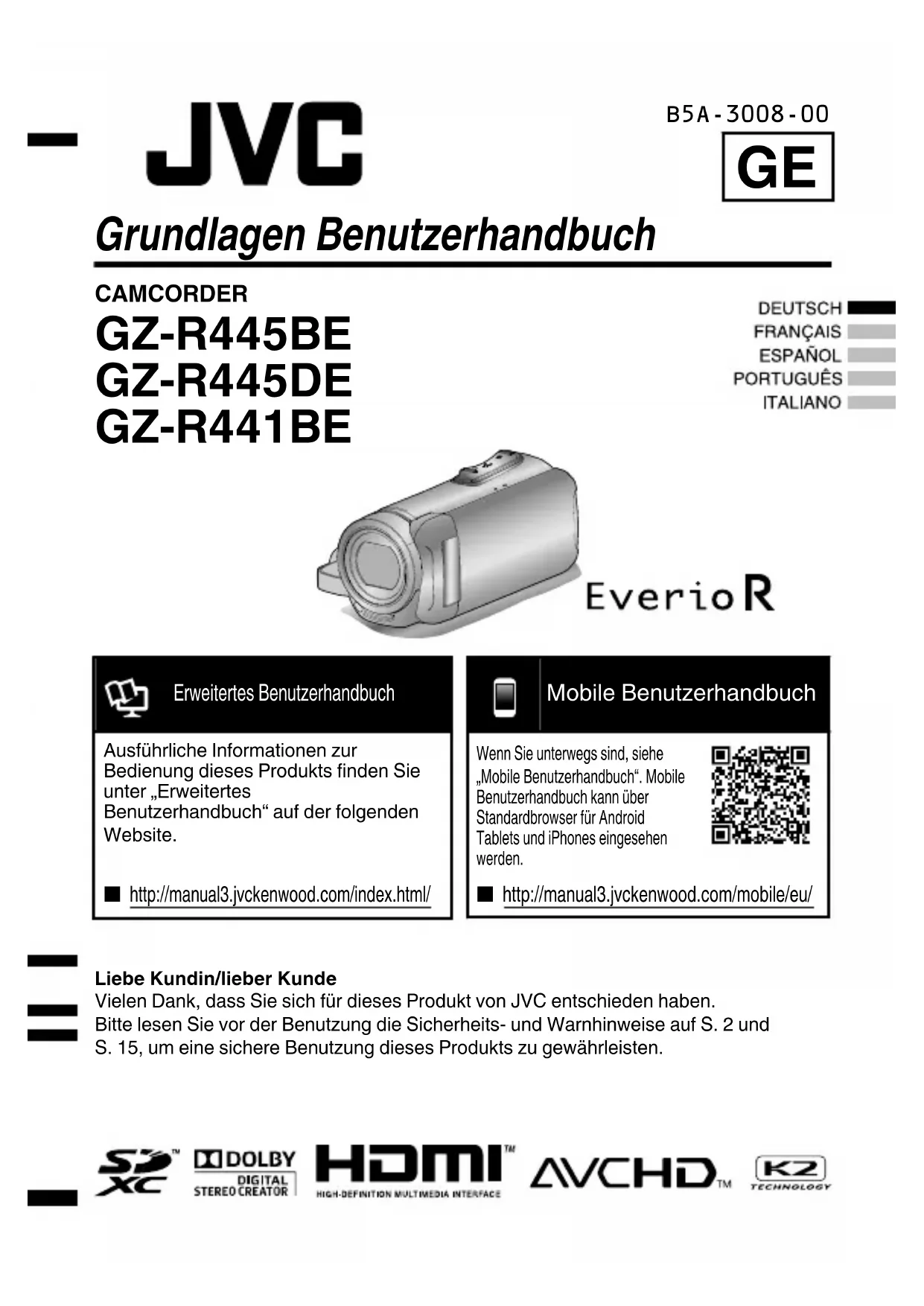 Grundlagen Benutzerhandbuch CAMCORDER GZ-R445BE GZ-R445DE GZ-R441BE Liebe Kundin/lieber KundeVielen Dank, dass Sie sich für dieses Produkt von JVC entschieden haben.Bitte lesen Sie vor der Benutzung die Sicherheits- und Warnhinweise auf S. 2 undS. 15, um eine sichere Benutzung dieses Produkts zu gewährleisten. B5A-3008-00