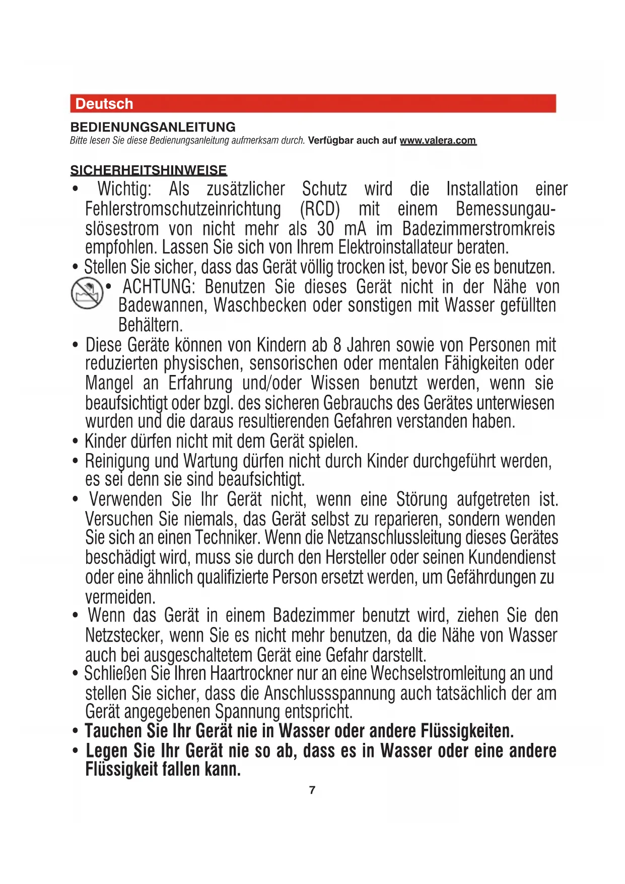 Sollten Sie die Garantie in Anspruch nehmen müssen, dann senden Sie bitte das defekte Gerät gut verpackt an eine unserer autorisierten Service-Stellen. Vergessen Sie nicht, unbedingt die Garantiekarte und/oder den Kaufbeleg beizufügen, da ohne diese keine Garantieleistung erfolgen kann. WICHTIG Alle in dieser Bedienungsanleitung angeführten Haartrockner sind NICHT für die Installation und den Gebrauch in öffentlichen Anlagen, Sporthallen, Wellness- und Fitness-Clubs, Spas etc. mit hohem Publikumsverkehr geeignet. Für Installation und Einsatz in kleineren öffentlichen Einri- chtungen, Sporthallen, Wellness- und Fitness-Clubs, Spas etc. mit niedriger Nutzungsfrequenz empfiehlt Valera aus- schließlich die folgenden Modelle: SN9000 P • 583.11/P