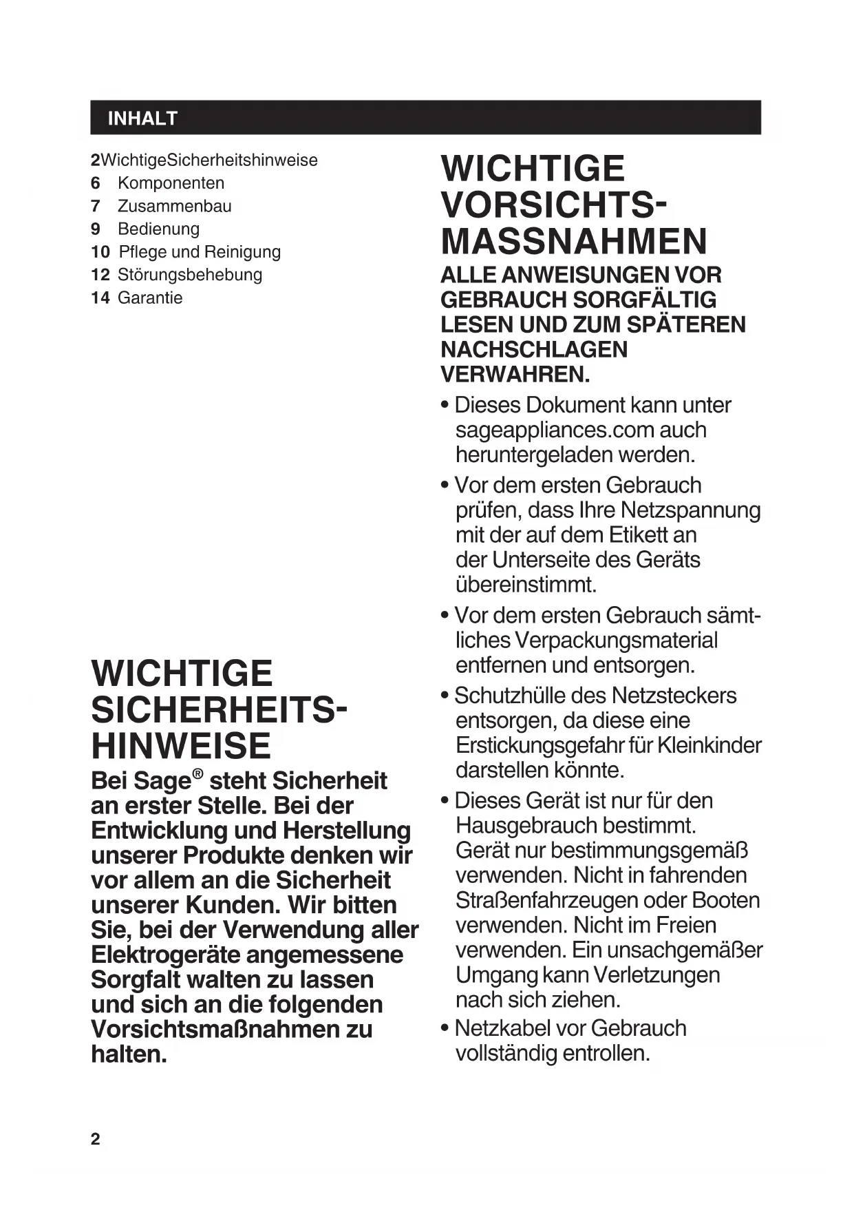 - Gerät nicht verwenden, wenn das Netzkabel, der Netzstecker oder das Gerät selbst in irgend- einer Weise beschädigt ist. Bei Beschädigung oder zur Wartung (außer Reinigung) Kontakt mit dem Sage- Kundendienst aufnehmen oder auf sageappliances.com gehen.