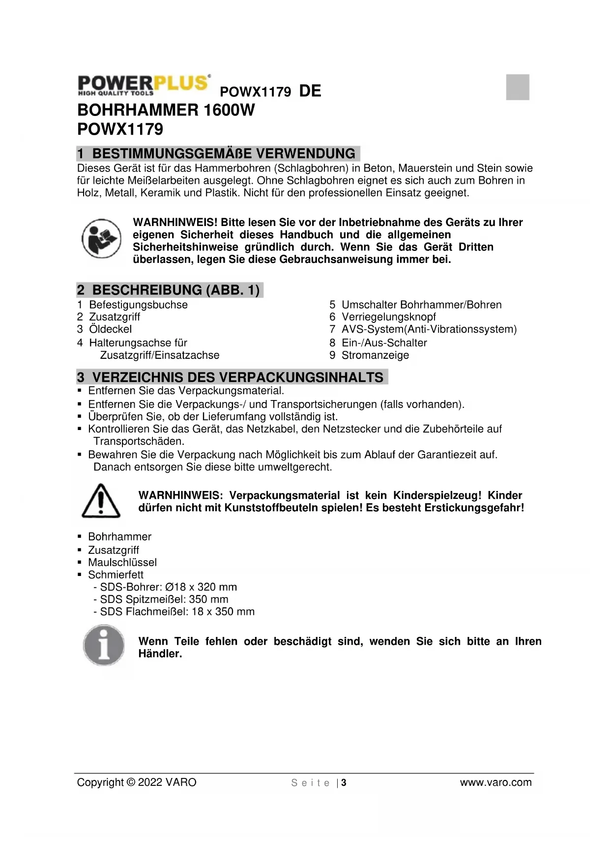 - Schmierfett - SDS-Bohrer: Ø18 x 320 mm - SDS Spitzmeißel: 350 mm - SDS Flachmeißel: 18 x 350 mm Wenn Teile fehlen oder beschädigt sind, wenden Sie sich bitte an Ihren Händler.POWX1179 DE Copyright © 2022 VARO S e i t e | 4 www.varo.com