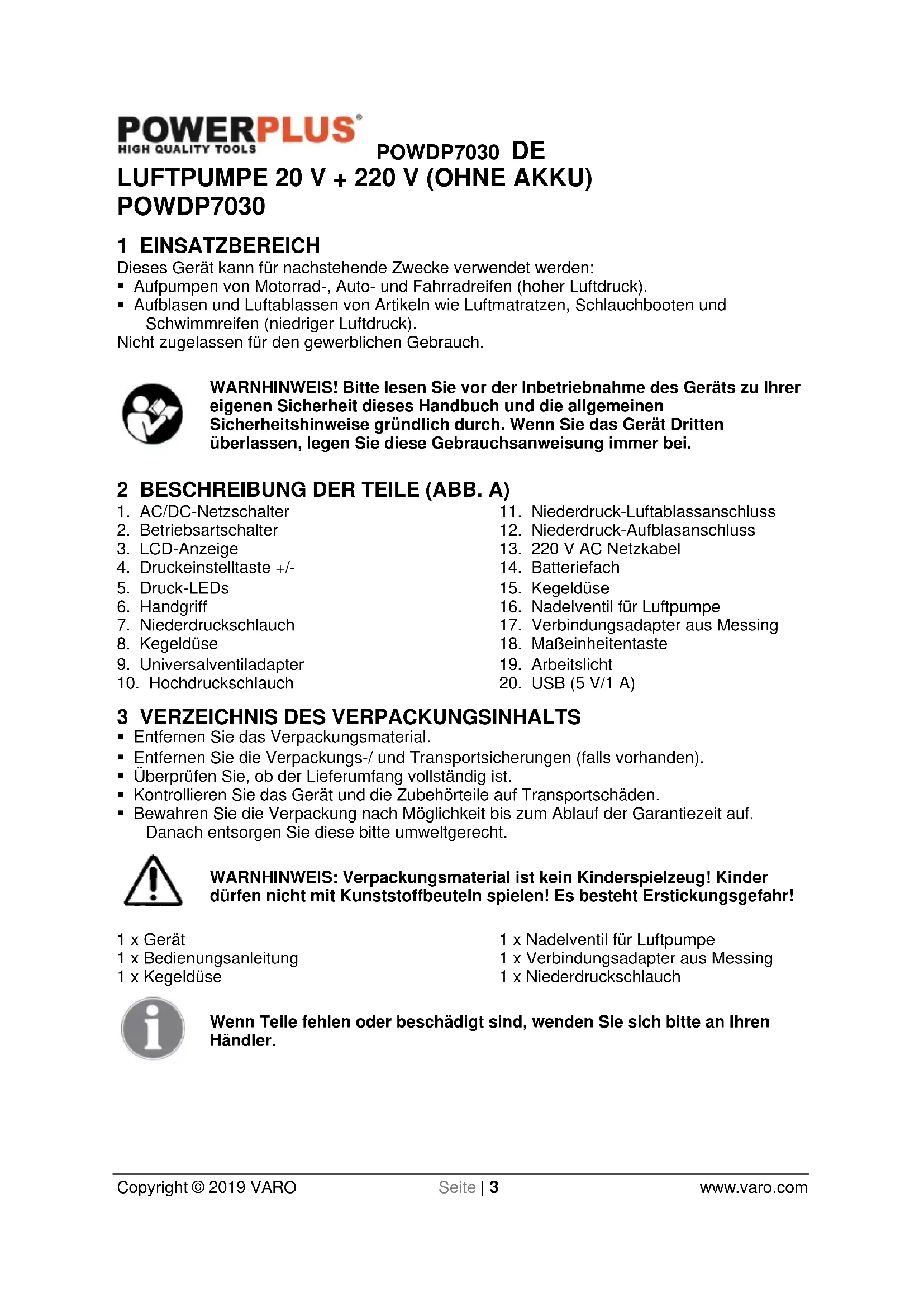Copyright © 2019 VARO Seite | 3 www.varo.com LUFTPUMPE 20 V + 220 V (OHNE AKKU) POWDP7030 1 EINSATZBEREICH Dieses Gerät kann für nachstehende Zwecke verwendet werden: