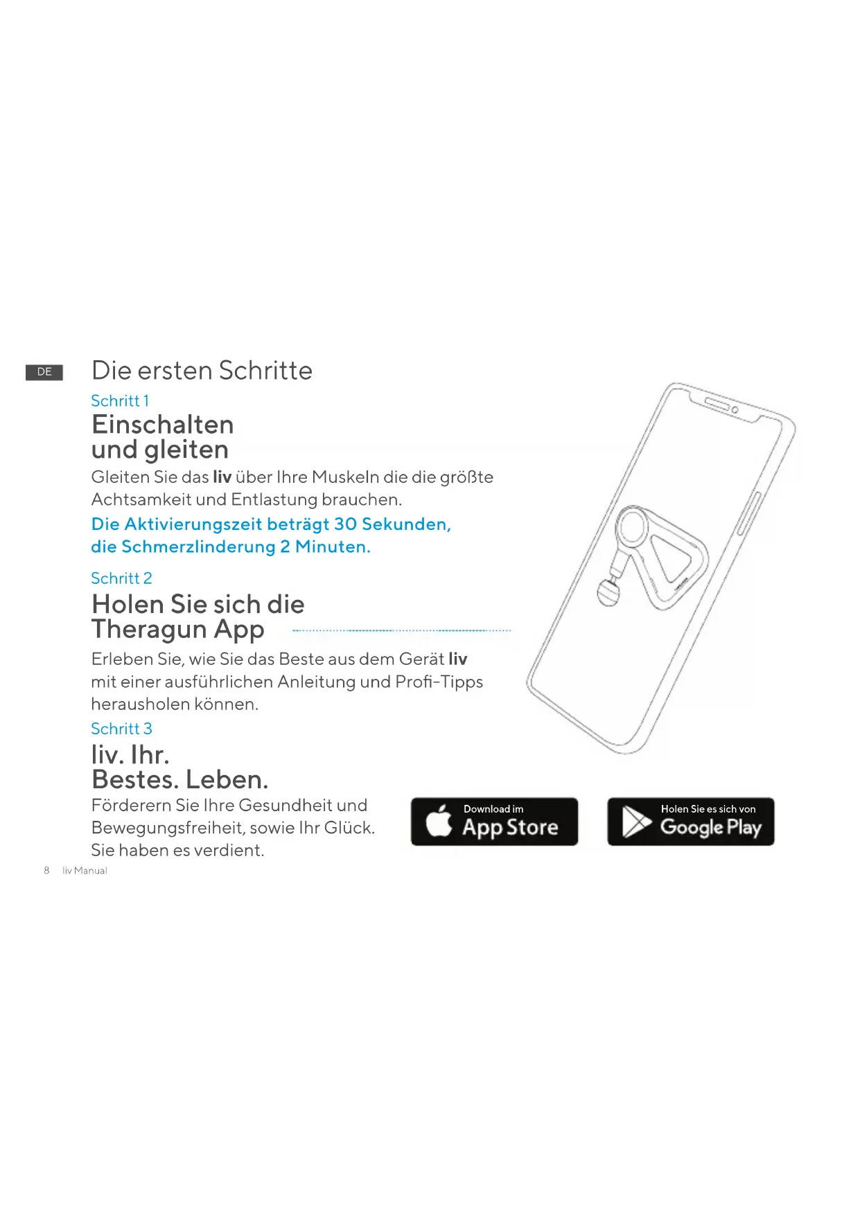 Schritt 2 Holen Sie sich die Theragun App Erleben Sie, wie Sie das Beste aus dem Gerät liv mit einer ausführlichen Anleitung und Pro-Tipps herausholen können. Schritt 3 liv. Ihr. Bestes. Leben. Förderern Sie Ihre Gesundheit und Bewegungsfreiheit, sowie Ihr Glück. Sie haben es verdient. Die ersten Schritte Schritt 1 Einschalten und gleiten Gleiten Sie das liv über Ihre Muskeln die die größte Achtsamkeit und Entlastung brauchen. Die Aktivierungszeit beträgt 30 Sekunden, die Schmerzlinderung 2 Minuten. Download im Holen Sie es sich vonliv Manual 9