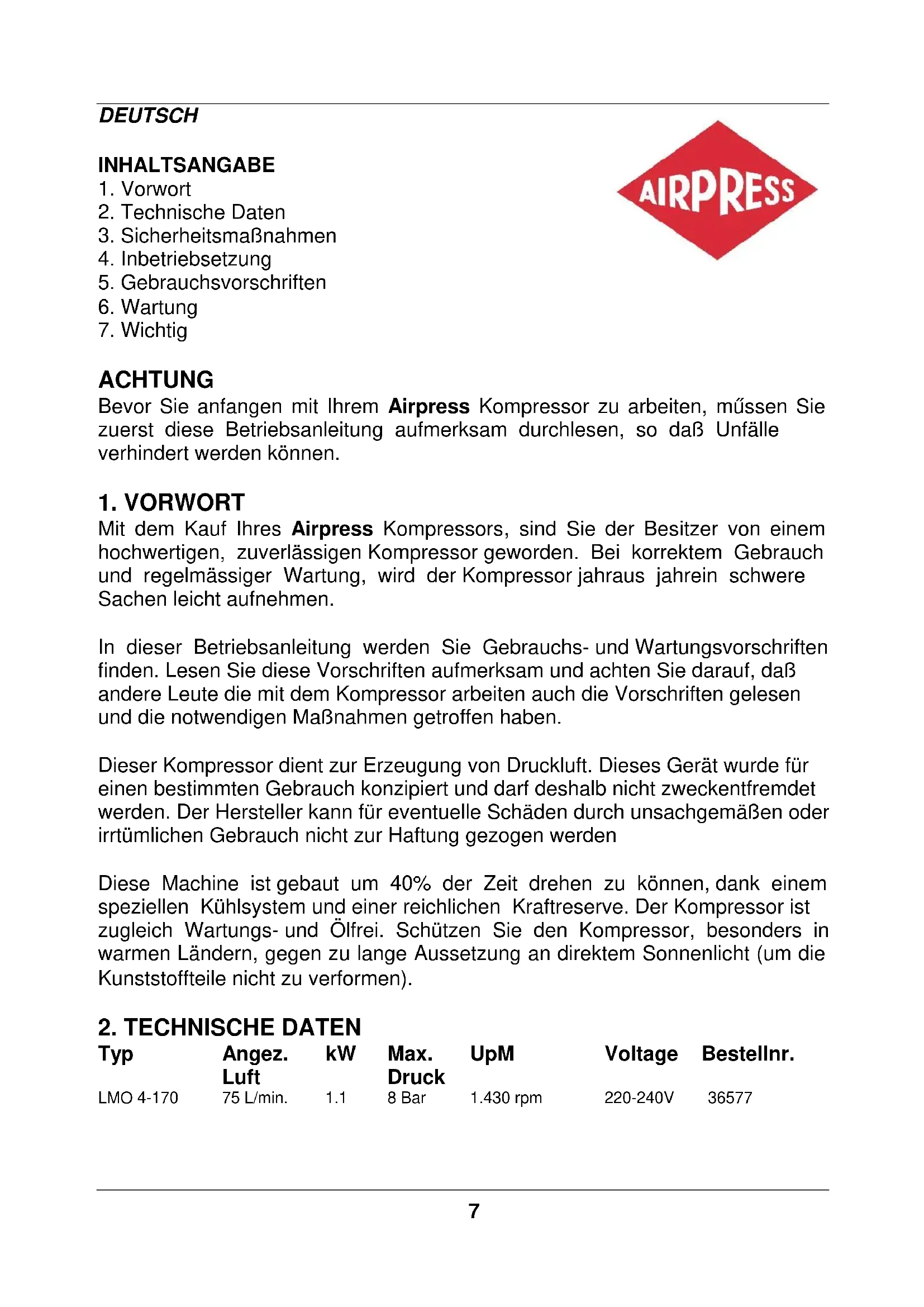 Mit dem Kauf Ihres Airpress Kompressors, sind Sie der Besitzer von einem hochwertigen, zuverlässigen Kompressor geworden. Bei korrektem Gebrauch und regelmässiger Wartung, wird der Kompressor jahraus jahrein schwere Sachen leicht aufnehmen. In dieser Betriebsanleitung werden Sie Gebrauchs- und Wartungsvorschriften finden. Lesen Sie diese Vorschriften aufmerksam und achten Sie darauf, daß andere Leute die mit dem Kompressor arbeiten auch die Vorschriften gelesen und die notwendigen Maßnahmen getroffen haben. Dieser Kompressor dient zur Erzeugung von Druckluft. Dieses Gerät wurde für einen bestimmten Gebrauch konzipiert und darf deshalb nicht zweckentfremdet werden. Der Hersteller kann für eventuelle Schäden durch unsachgemäßen oder irrtümlichen Gebrauch nicht zur Haftung gezogen werden Diese Machine ist gebaut um 40% der Zeit drehen zu können, dank einem speziellen Kühlsystem und einer reichlichen Kraftreserve. Der Kompressor ist zugleich Wartungs- und Ölfrei. Schützen Sie den Kompressor, besonders in warmen Ländern, gegen zu lange Aussetzung an direktem Sonnenlicht (um die Kunststoffteile nicht zu verformen).