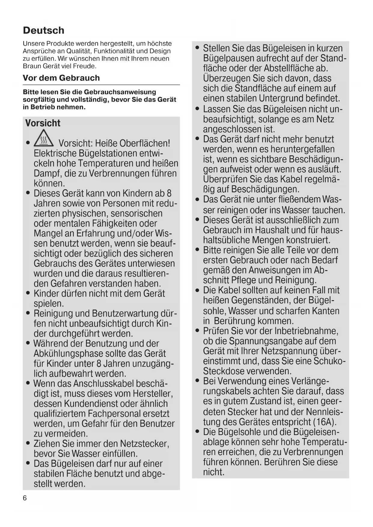 Vorsicht: Heiße Oberflächen! Elektrische Bügelstationen entwi- ckeln hohe Temperaturen und heißen Dampf, die zu Verbrennungen führen können.