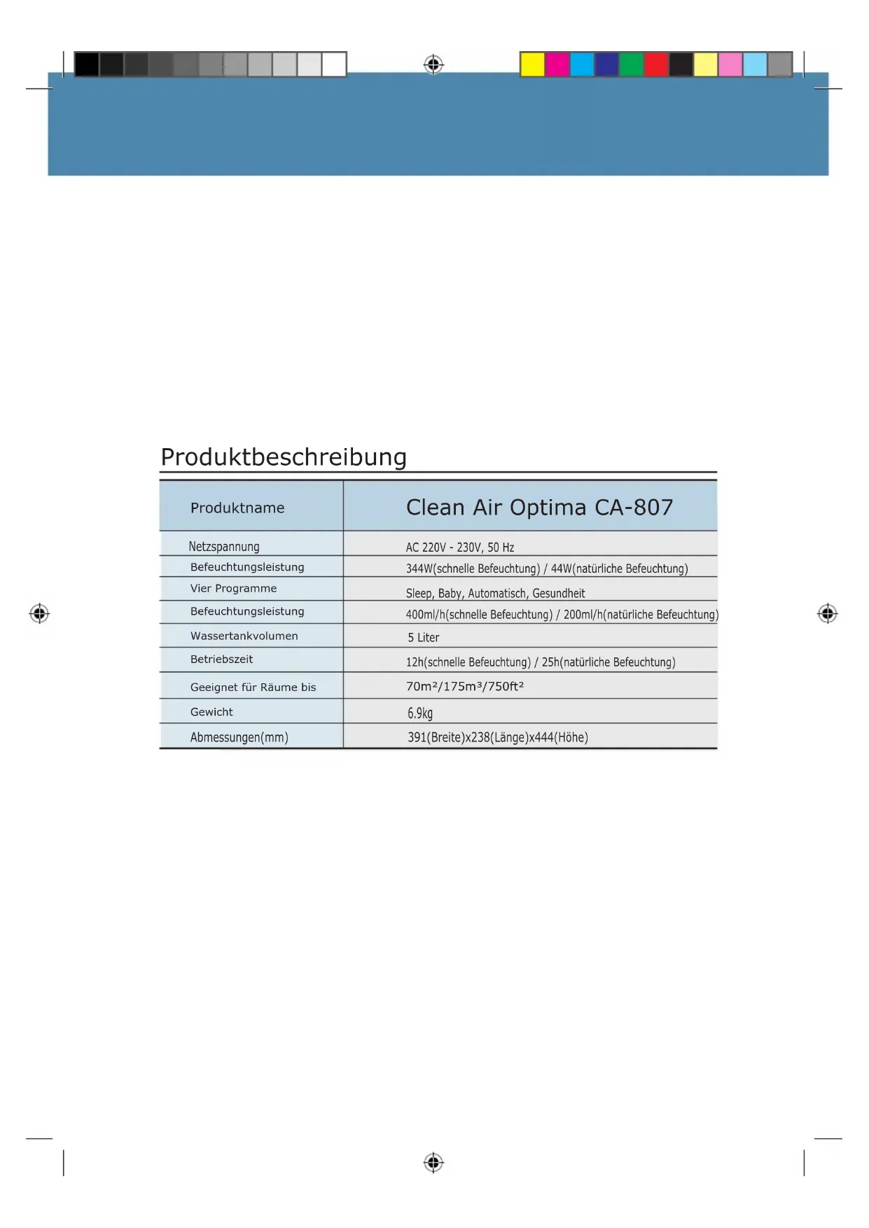 40% 60% Anleitung CA-807 Luftwäscher 2in1: Luftbefeuchter & Luftreiniger6.9kg 5 Liter344W(schnelle Befeuchtung) / 44W(natürliche Befeuchtung)400ml/h(schnelle Befeuchtung) / 200ml/h(natürliche Befeuchtung)12h(schnelle Befeuchtung) / 25h(natürliche Befeuchtung)Sleep, Baby, Automatisch, GesundheitBefeuchtungsleistungWassertankvolumenGewichtBefeuchtungsleistungVier ProgrammeBetriebszeitGeeignet für Räume bis70m²/175m³/750ft² Abmessungen(mm) 391(Breite)x238(Länge)x444(Höhe) Netzspannung AC 220V - 230V, 50 Hz Produktbeschreibung Produktname Clean Air Optima CA-8073 Inhaltsverzeichnis Name und Funktion der Einzelteile..….……… 10 Gebrauch Installation........……………………………………… 12 Verwendung ……….………….......…………………… 15 Reinigung………...........………….…………………… 19 Bei Störungen Was tun?........................……………………… 23 Vor dem Gebrauch Sicherheitsbestimmungen….....……………… 04 Vorsicht bei der Benutzung.........……………… 13 Hinweise.............…………….......………………… 14